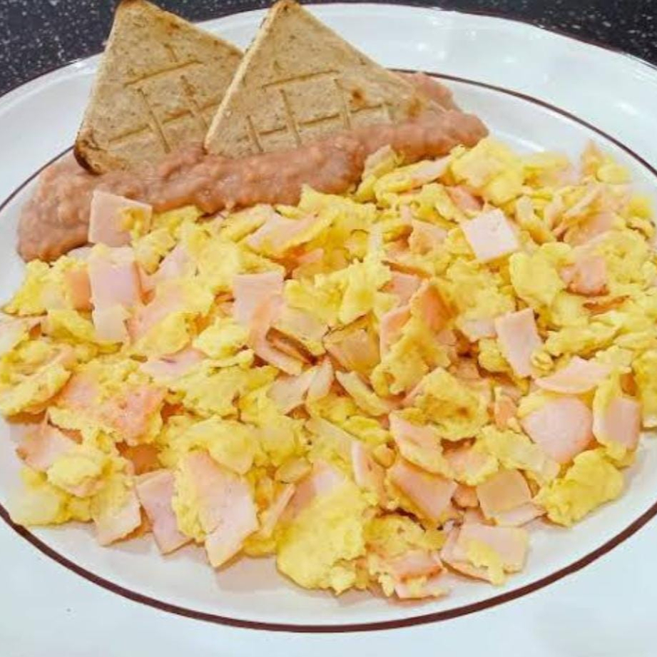 Huevo con jamón acompañado de frijoles refritos 3 pz totopos queso 1 pz bolillo