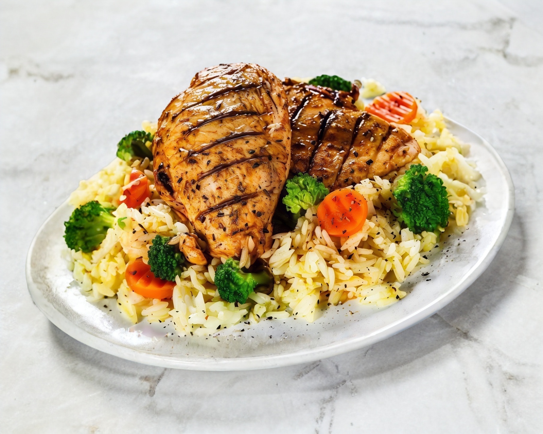 Pechuga de pollo asada servida con ensalada o papas fritas, acompañada de arroz, pasta o frijoles, pan o tortillas a tu eleccion