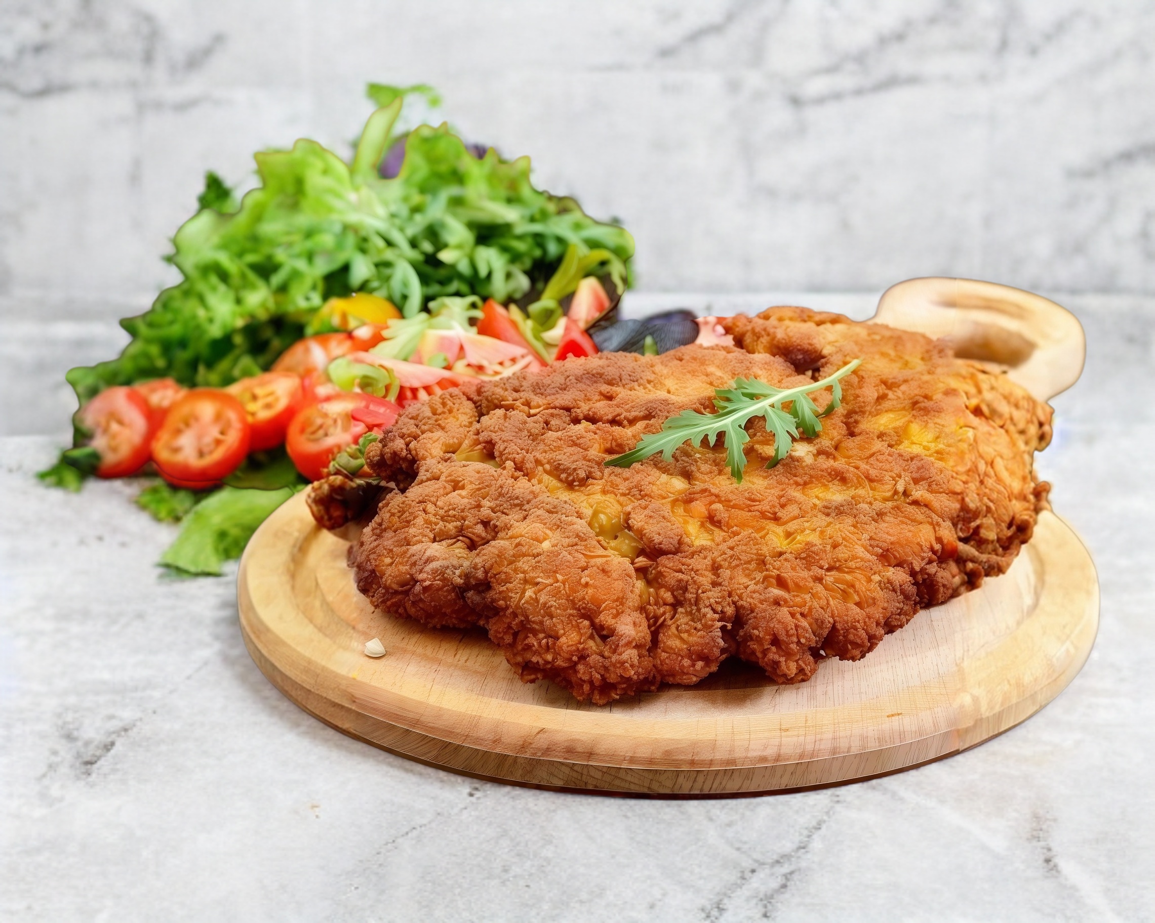 Ensalada jumbo servida con pechuga empanizada servdia con frutas del dia, queso, crotones y aderezo