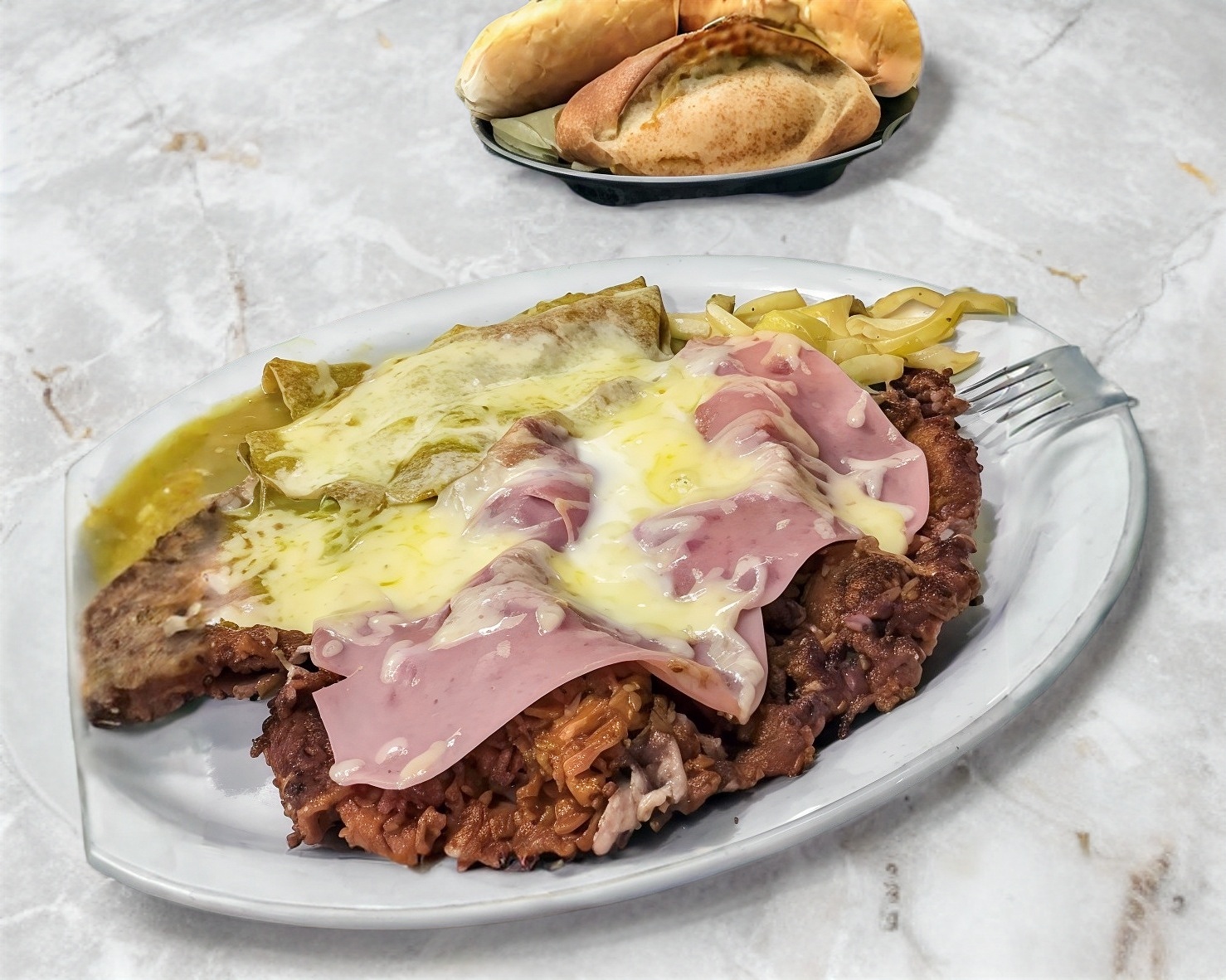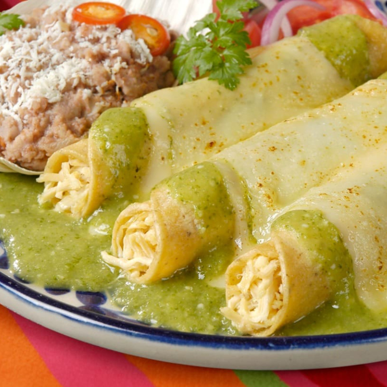 MilaEnchiladas verdes, acompañadas de arroz, pasta o frijoles, pan o tortillas a tu eleccion