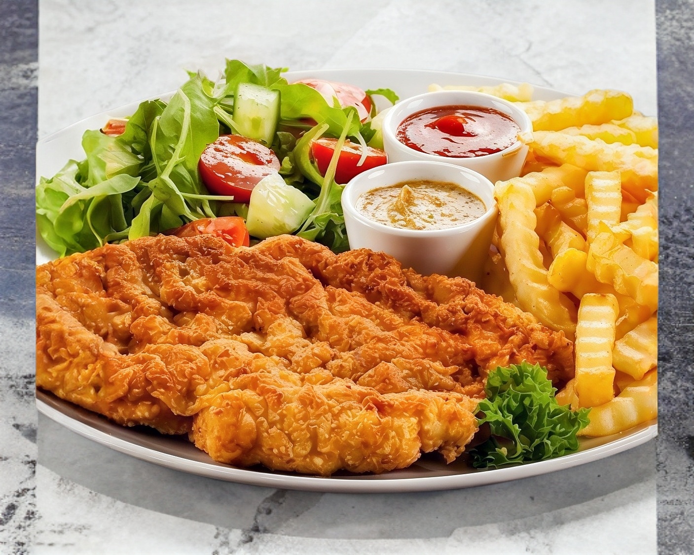Milanesa de res empanizada servida con ensalada o papas fritas, acompañada de arroz, pasta o frijoles, pan o tortillas a tu eleccion(porcion personal)