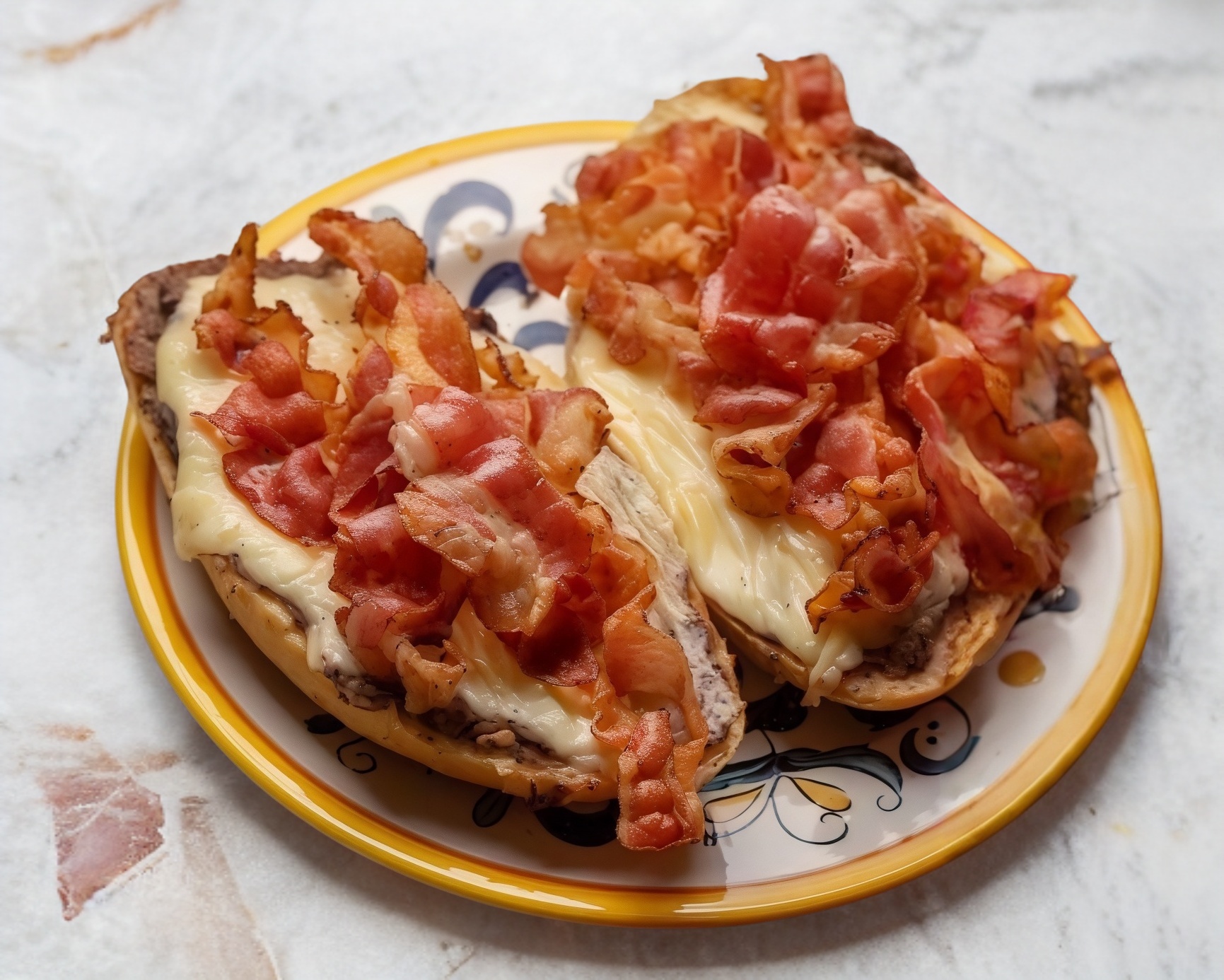 2pzs de molletes con queso manchego, jamon y tocino, acompañados de pico de gallo.