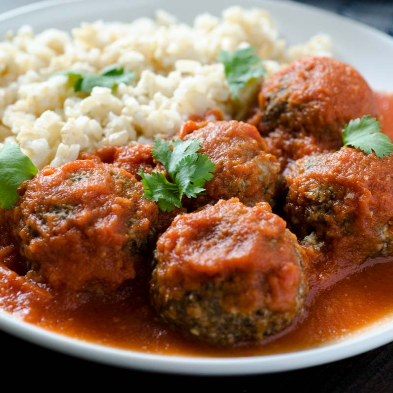 Albondigas en caldillo rojo servidas con pasta, arroz o frijoles
