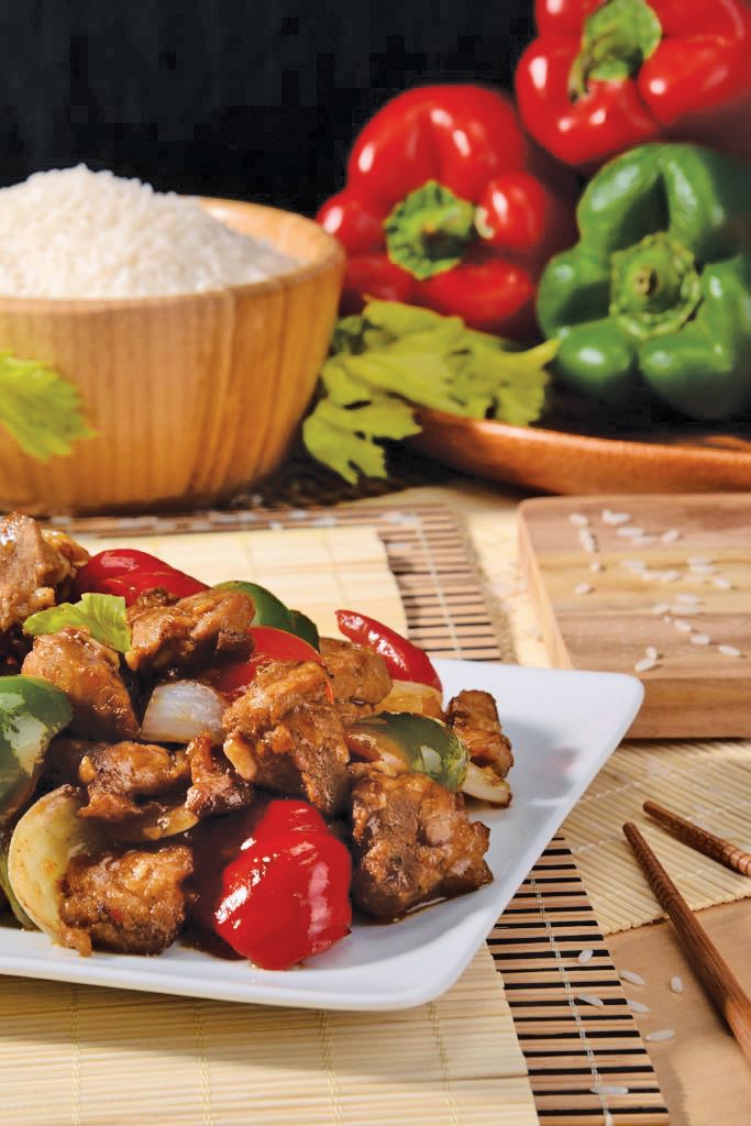 Arroz o Pasta + Pollo Cantones + Carne Enchilada + Combinación china + 1 Rollito primavera