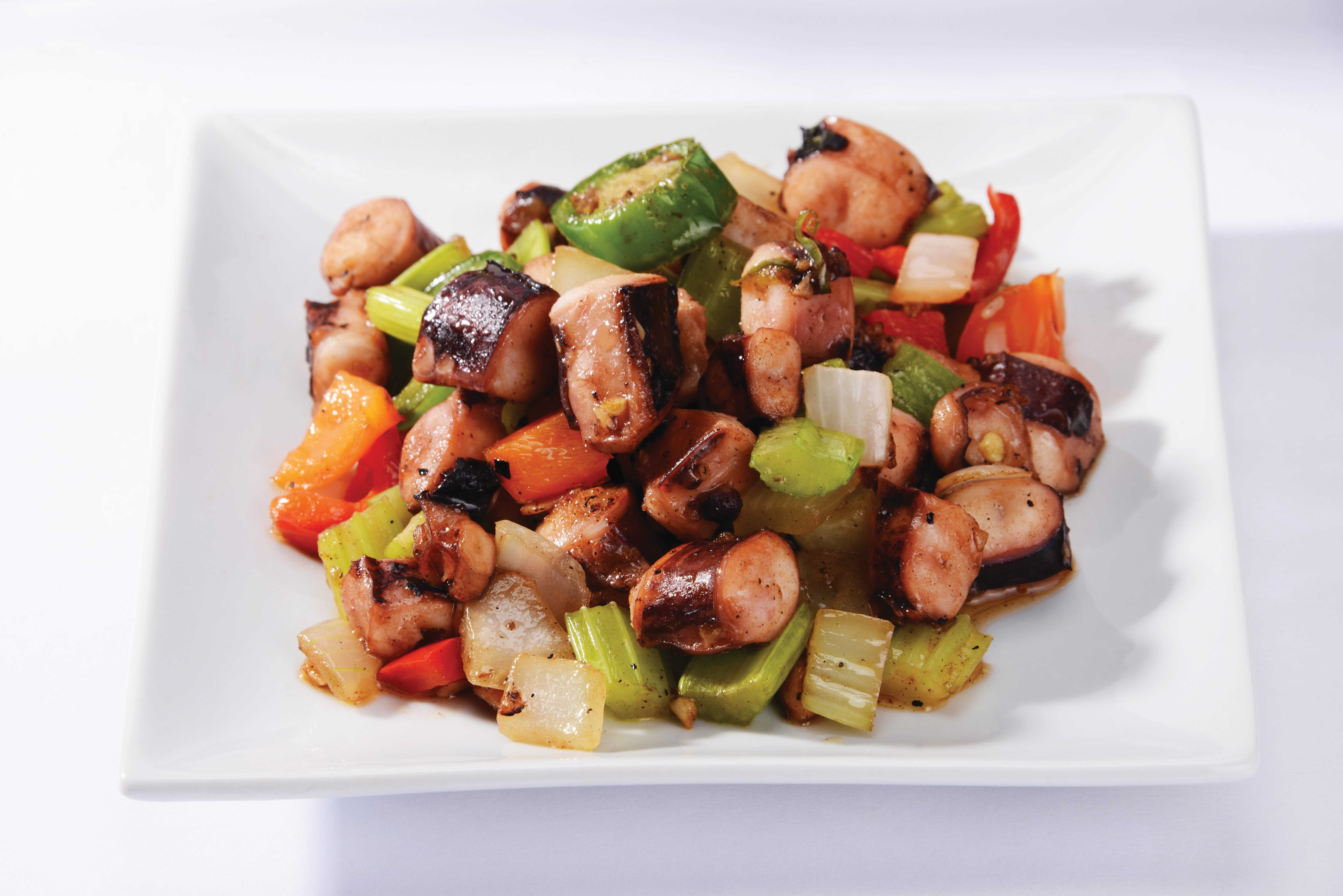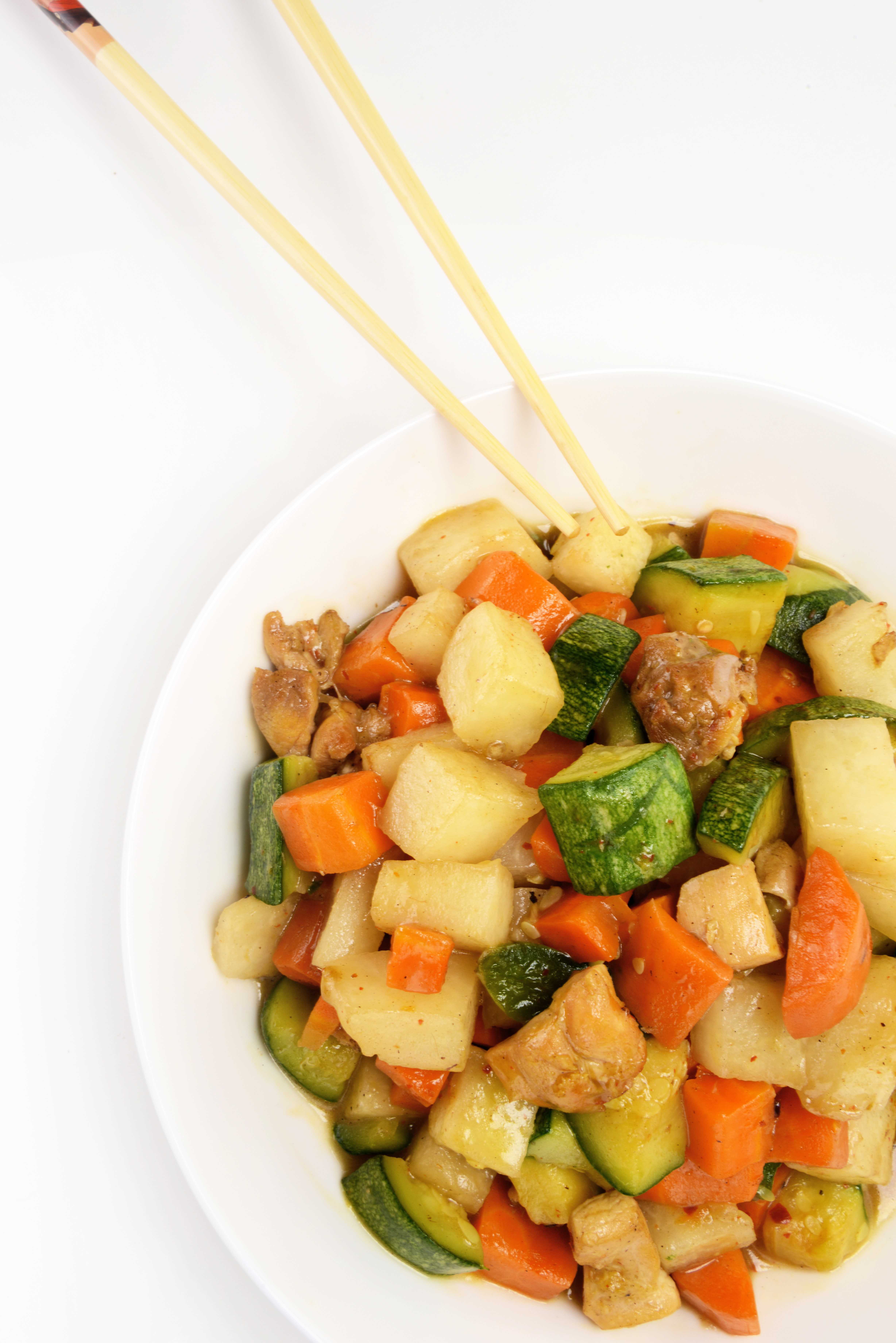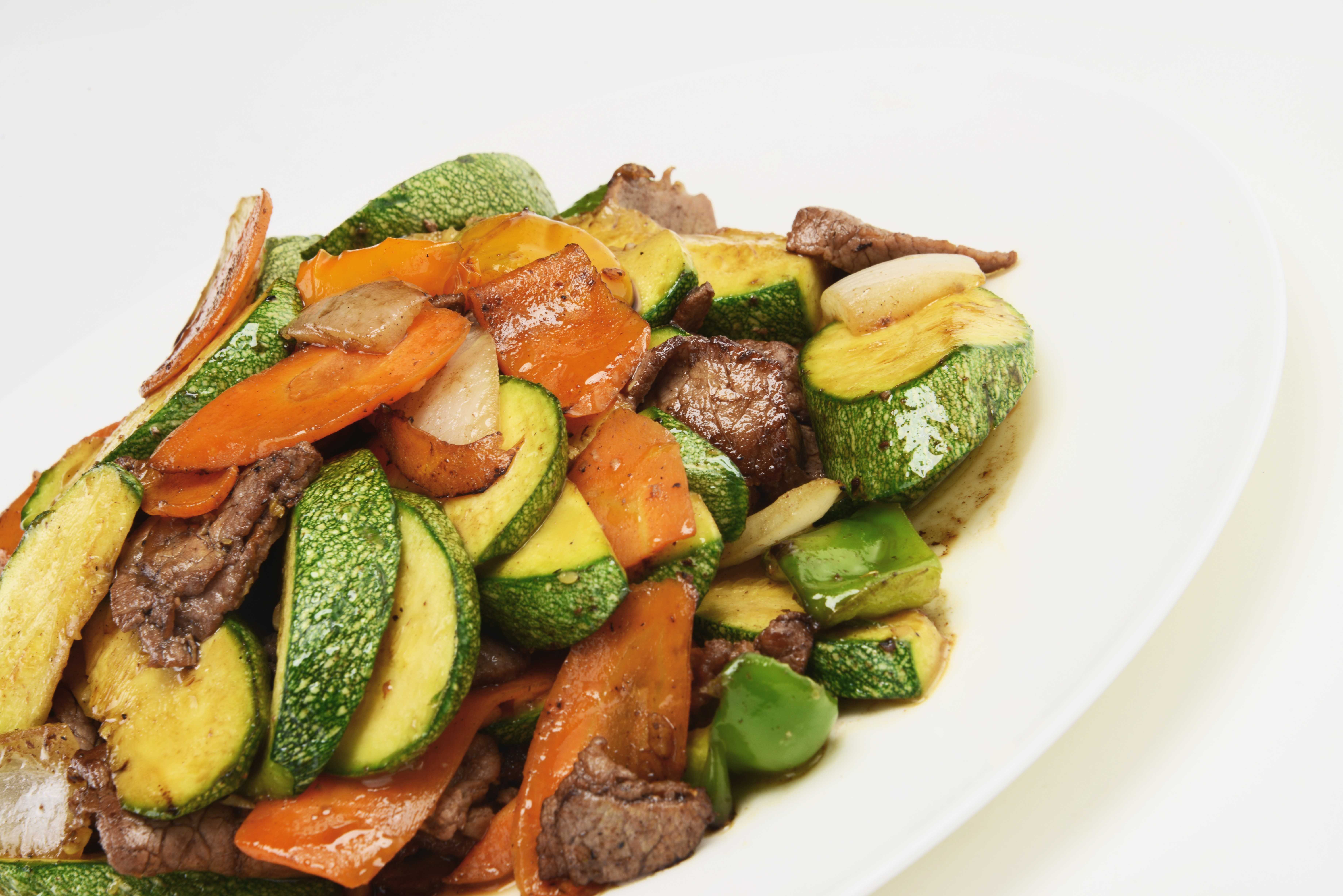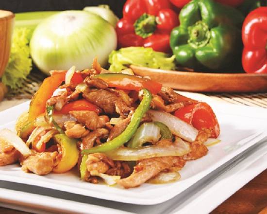 Arroz o Pasta + Pollo Cantones + Calabaza Con Bistec + 1 Rollito primavera