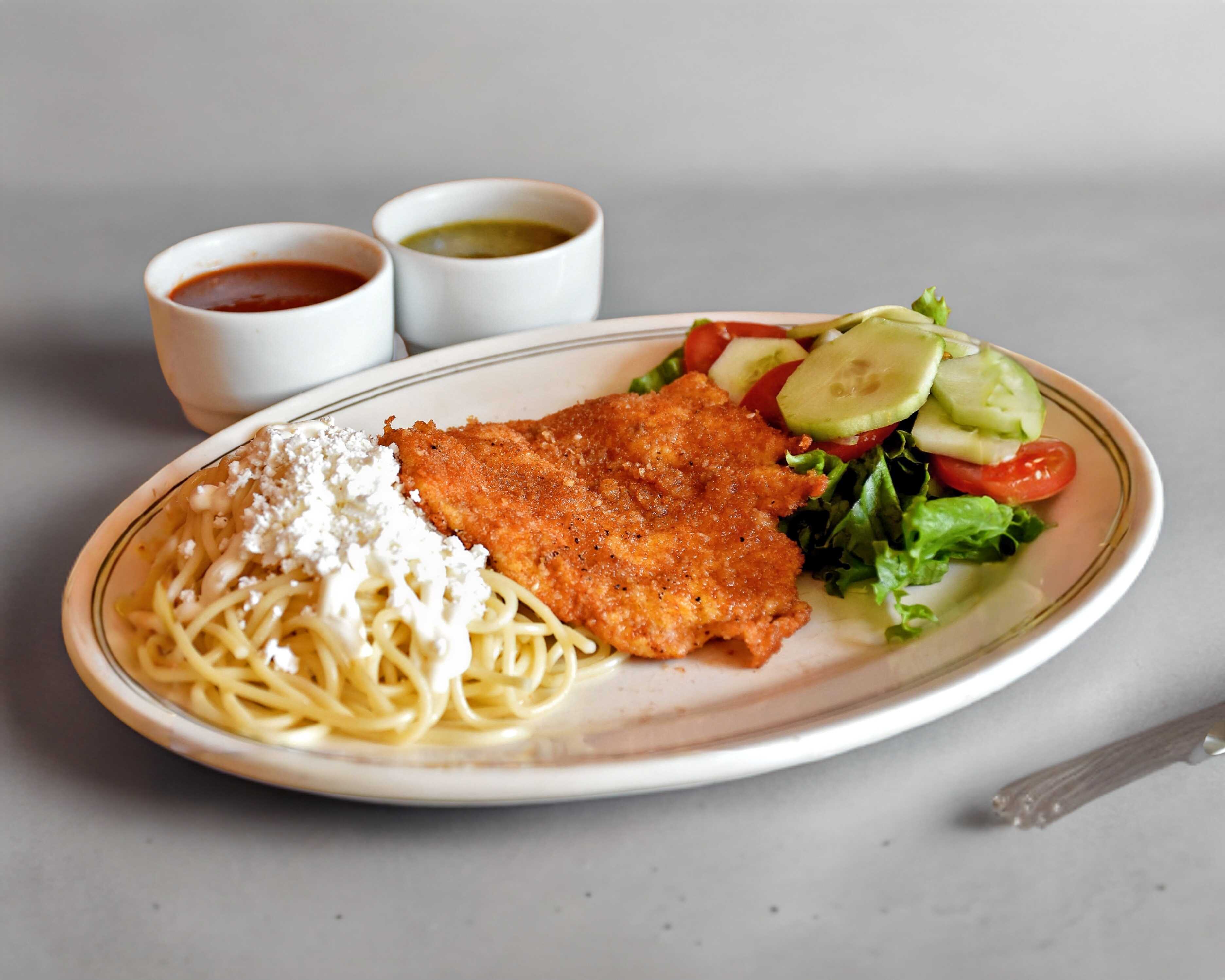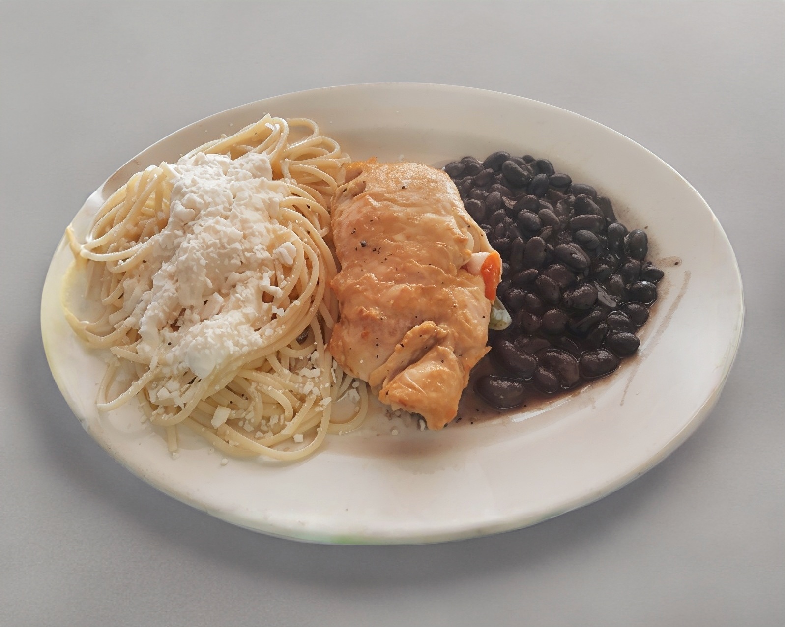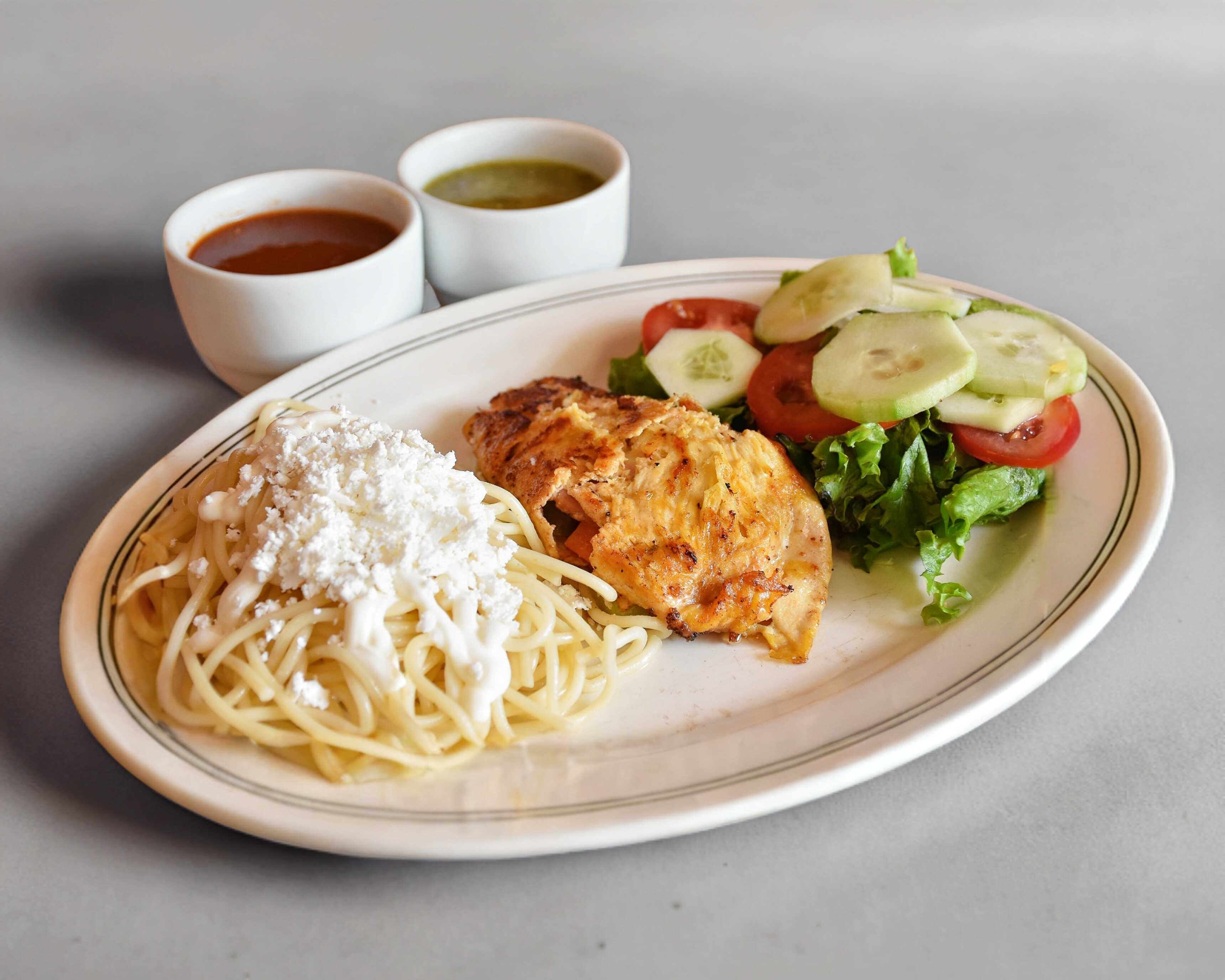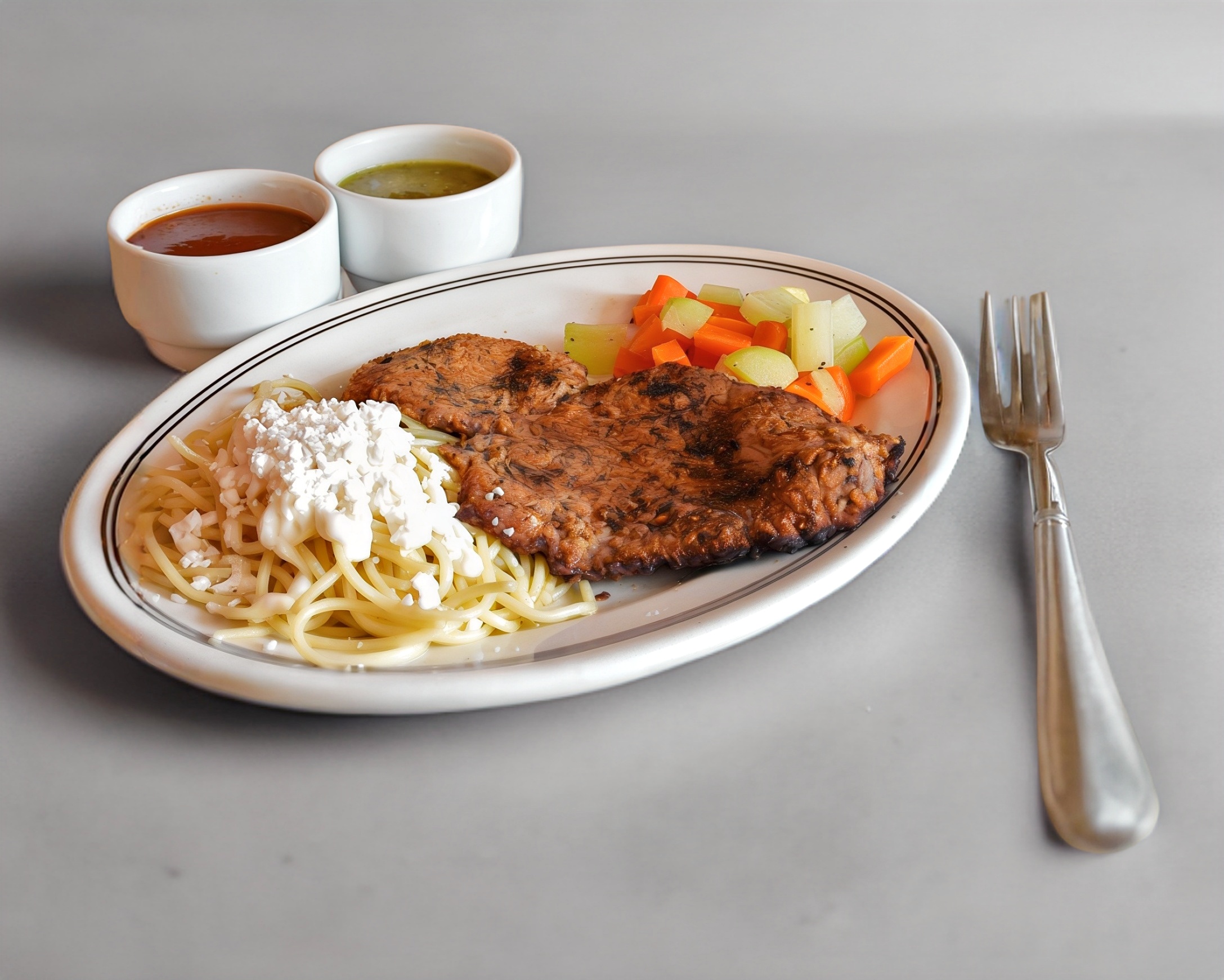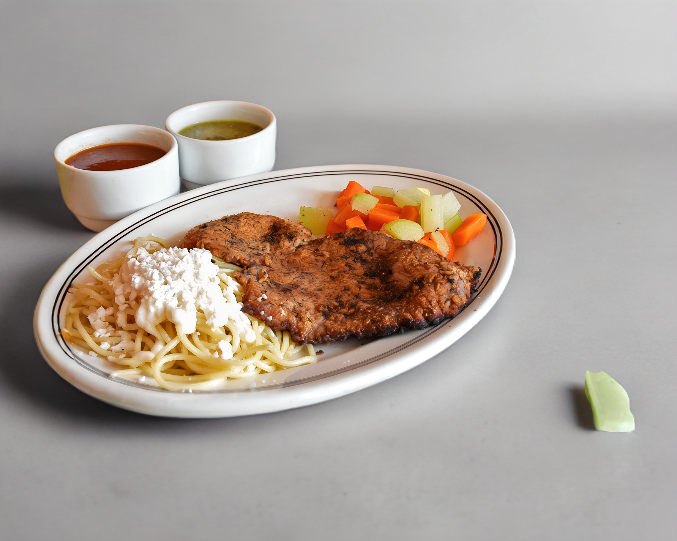 Incluye consomé ó sopa de pasta, más dos guarniciones a escoger, tortilla ó pan.