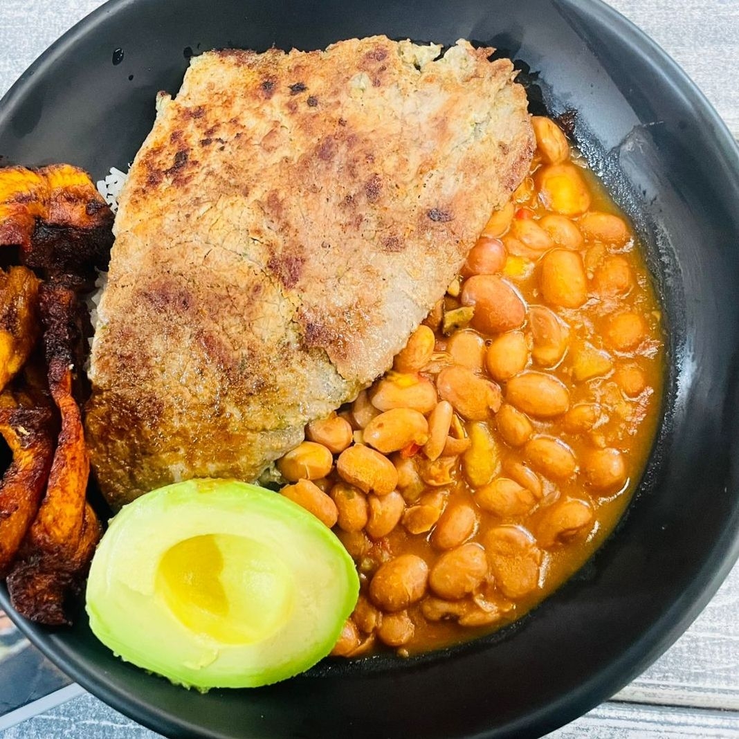 Mezcla de arroz y frijoles acompañada de carne de res.