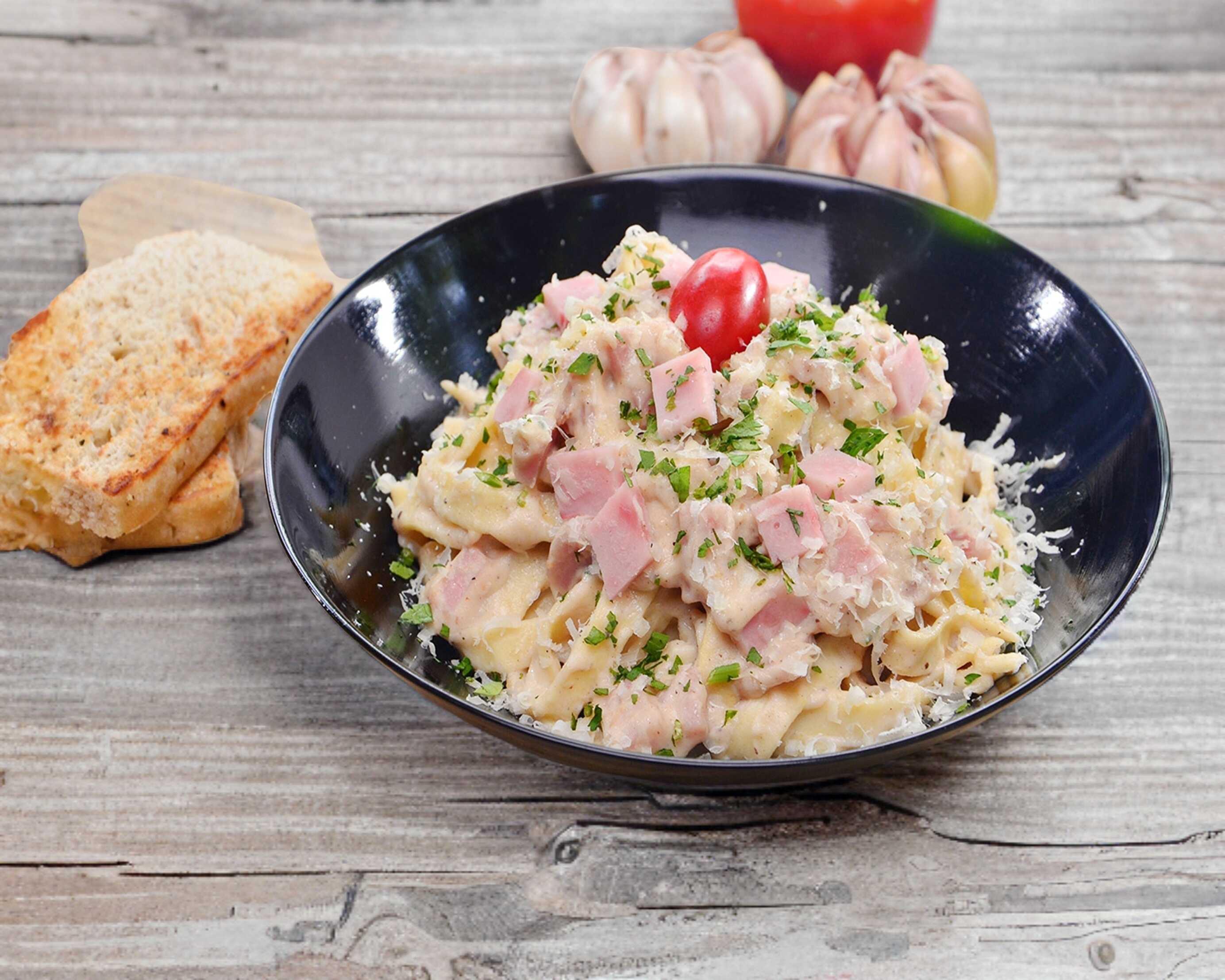 Jamón, salsa blanco y queso parmesano.