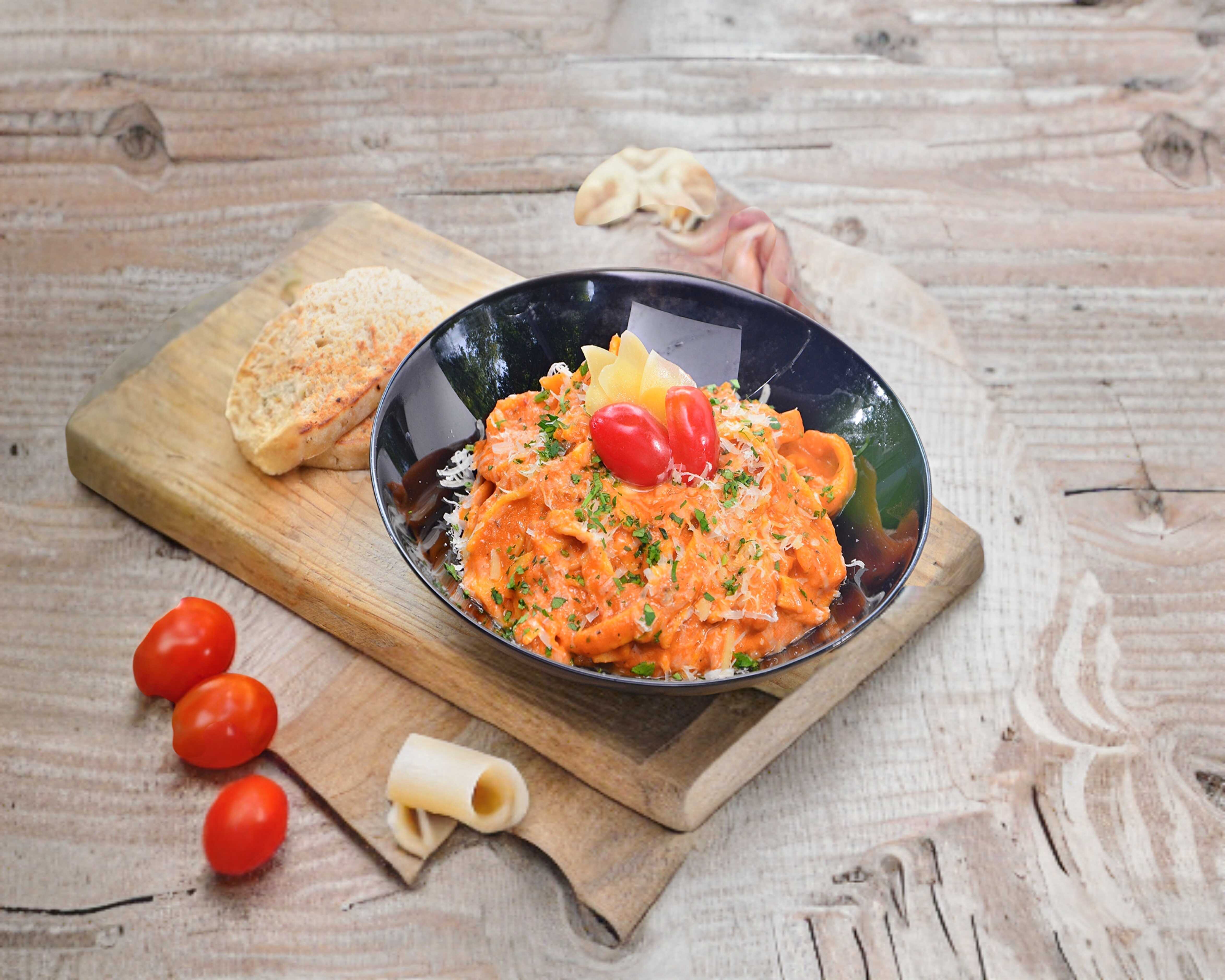 Salsa de tomate, ajo, crema, perejil y queso parmesano.