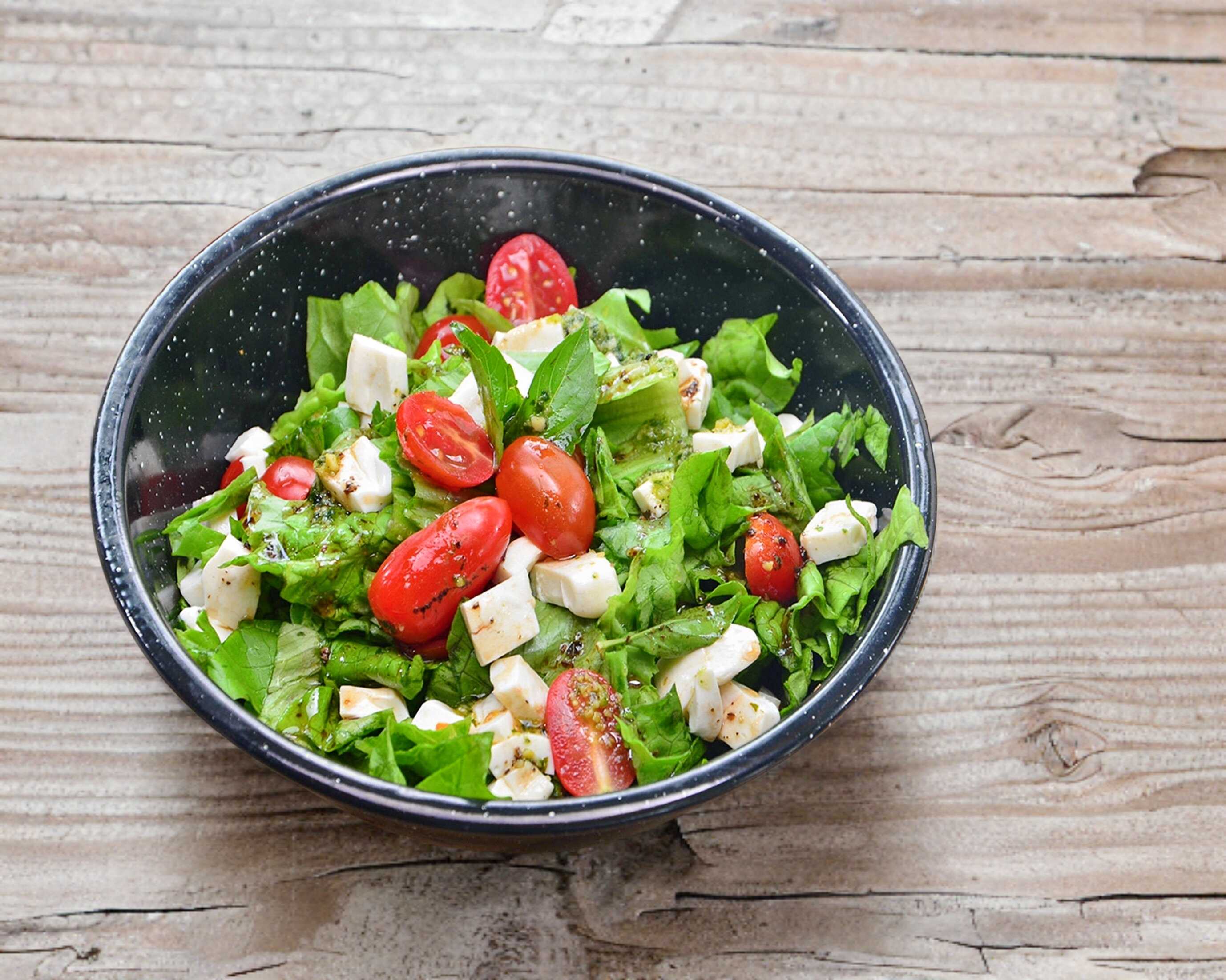Tomate cherry, queso mozzarella, albahaca, vinagreta de balsámico y un toque de pesto.