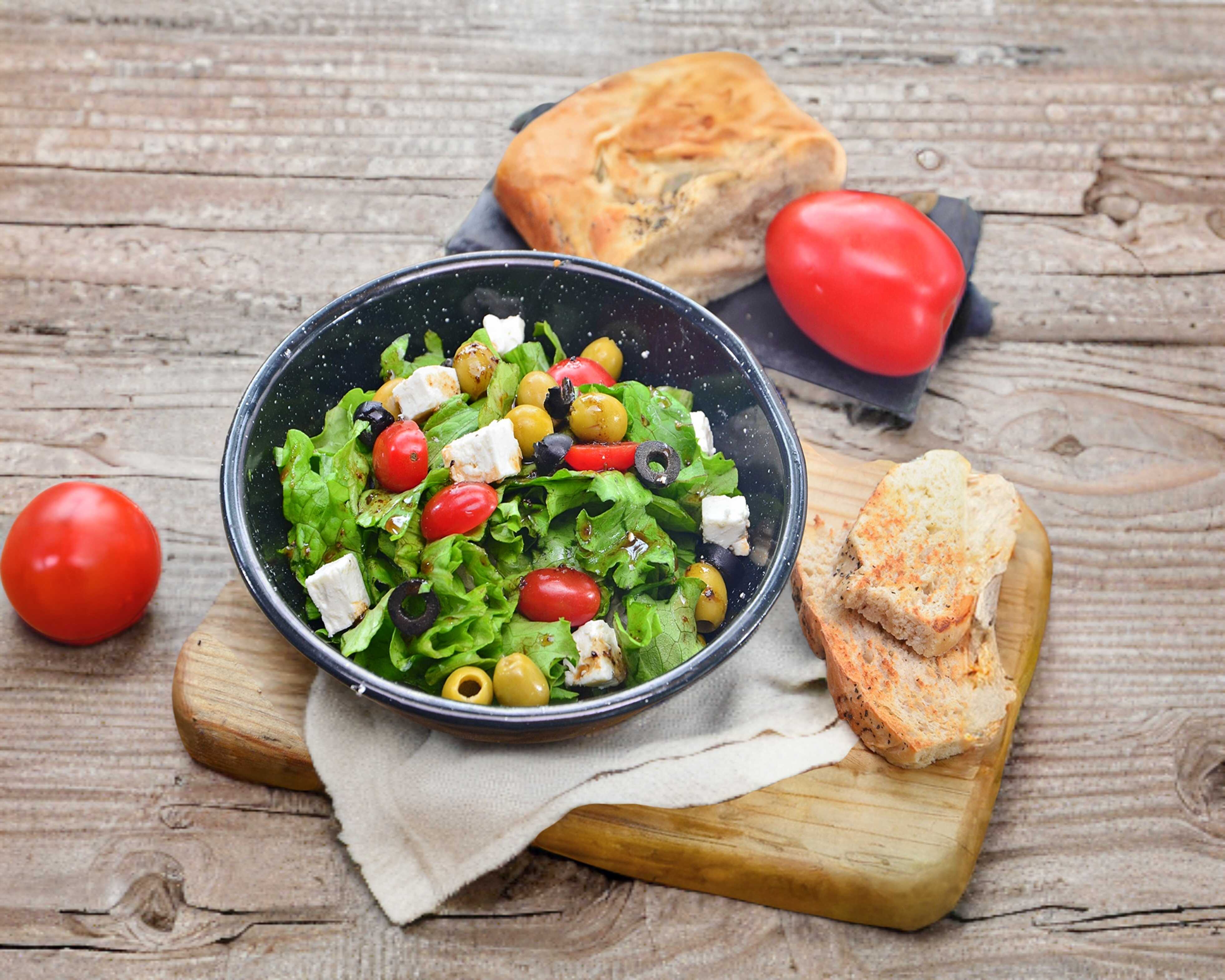 Tomate cherry, albahaca, aceitunas mixtas, queso feta, vinagreta de balsámico.