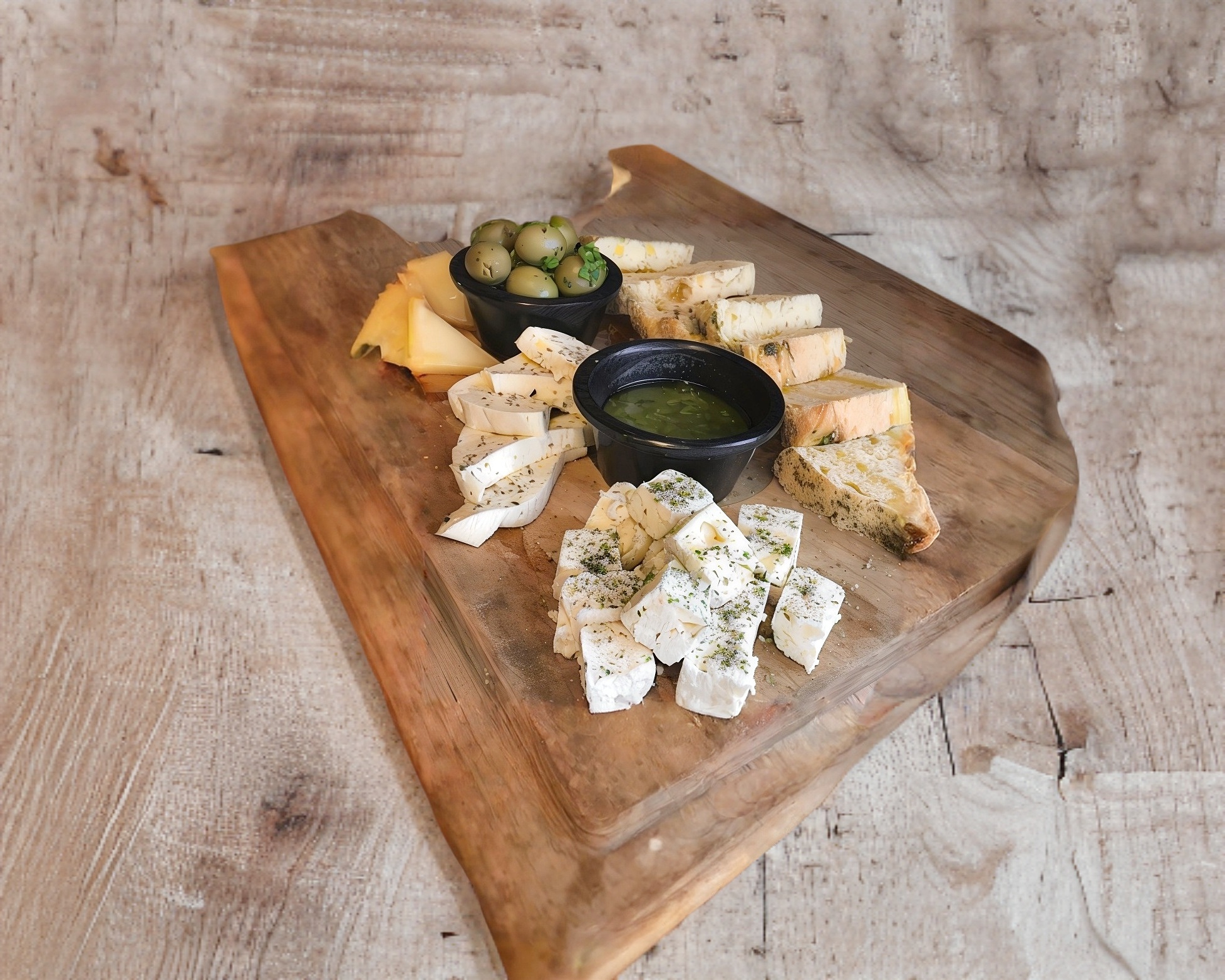 Tabla de quesos: feta, mozzarella fresco y parmesano, focaccia, aceitunas verdes y pesto con nuez de la India.