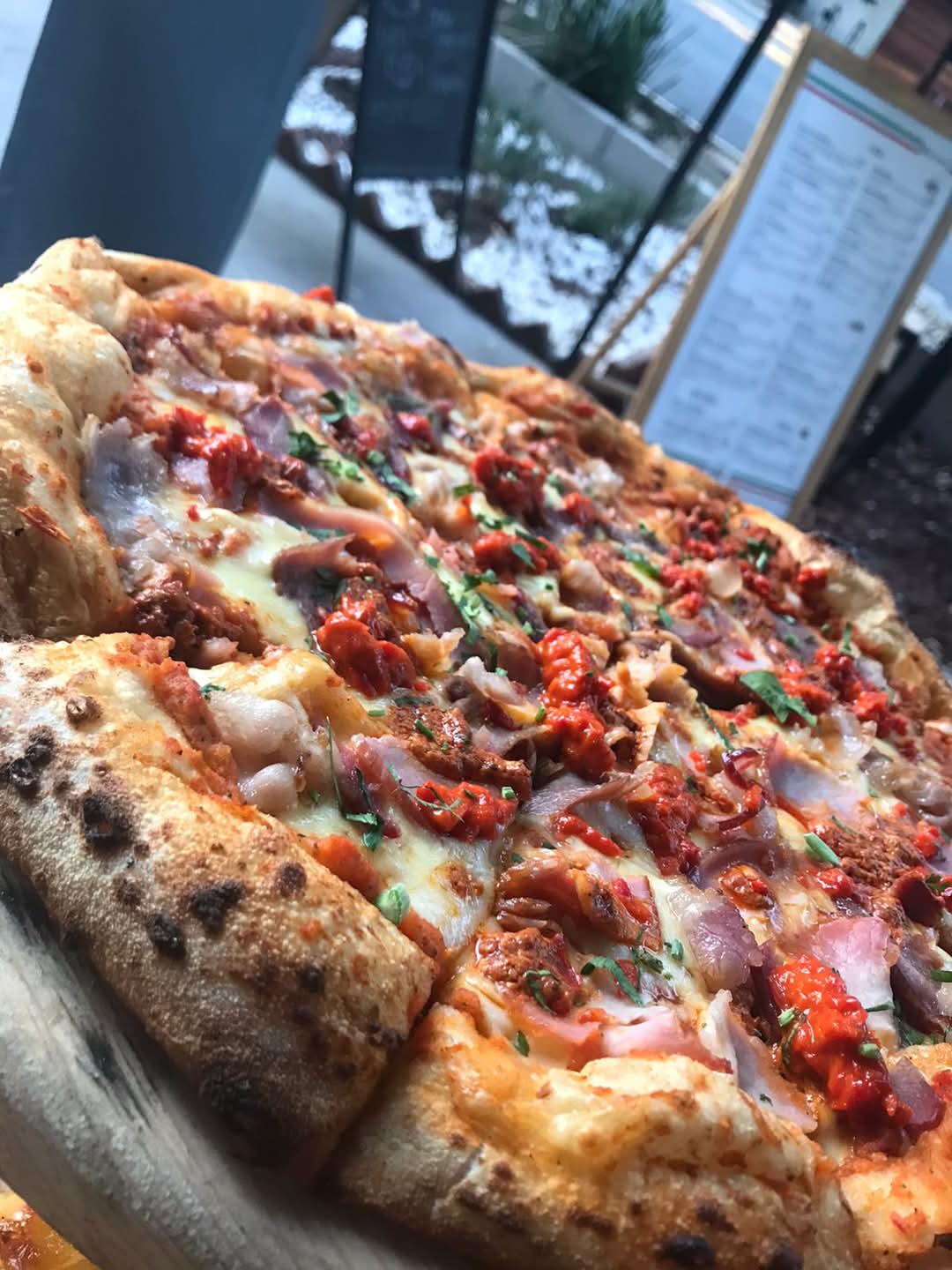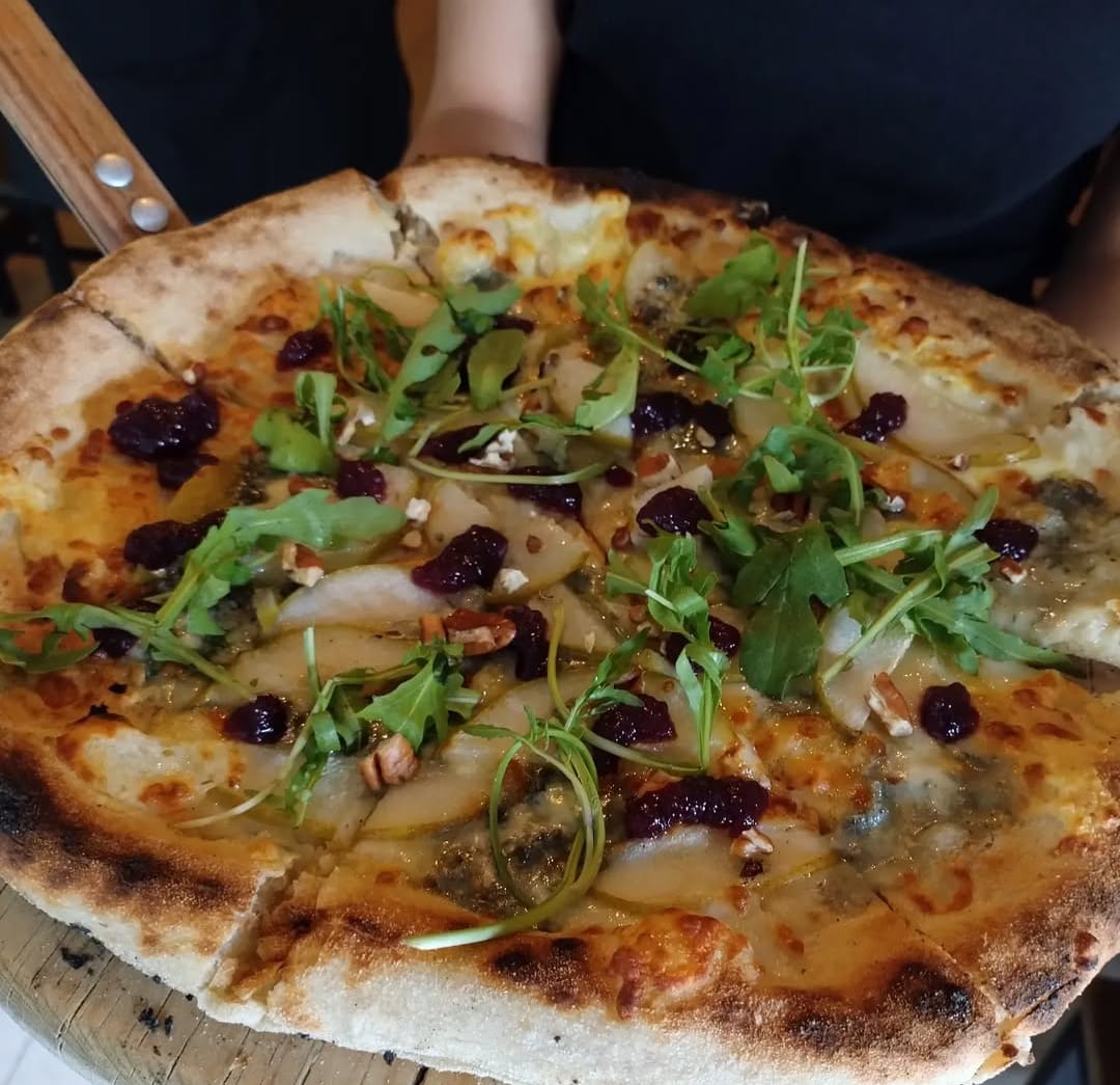 pizza estilo napolitano, con queso mozzarella, queso gorgonzola, pera, nuez, arugula y reducción de vino tinton