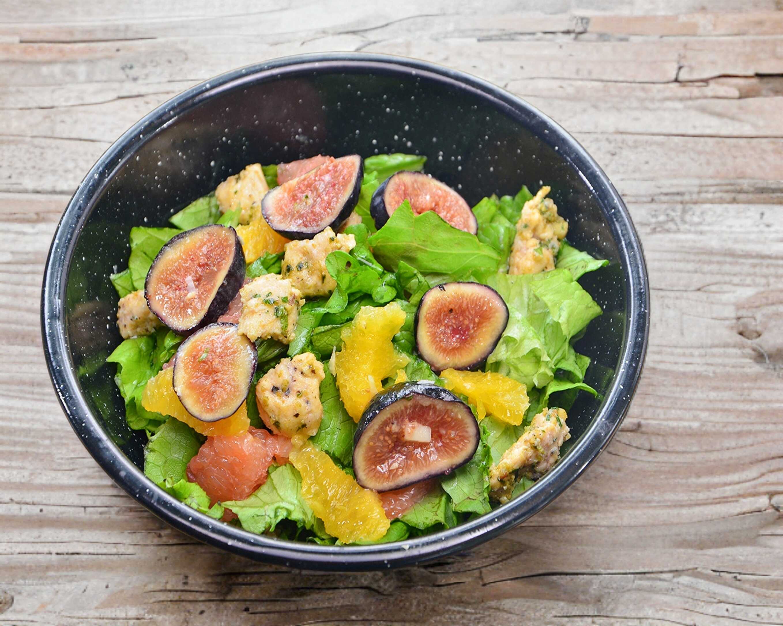 Pechuga de pollo, supremas de naranja, toronja, higo, ajonjolí garapiñado y vinagreta de cítricos.