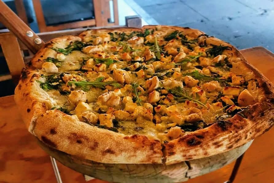 Base de salsa bechamel, espinacas, pollo, queso feta, mozarella y arúgula
