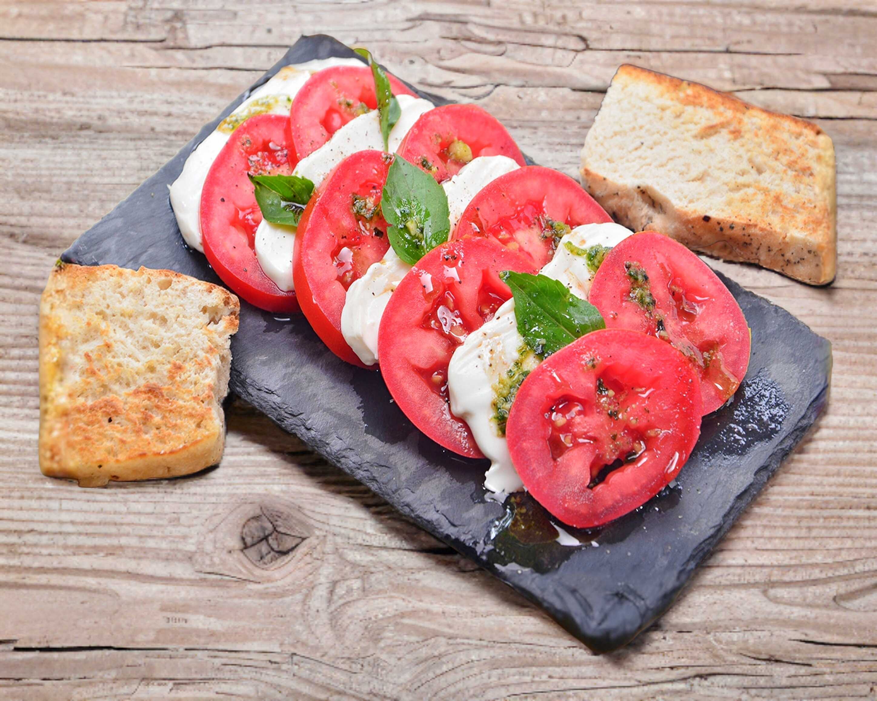 Rodajas de jitomate fresco, queso mozzarella, albahaca, vinagreta de balsámico y toque de pesto.