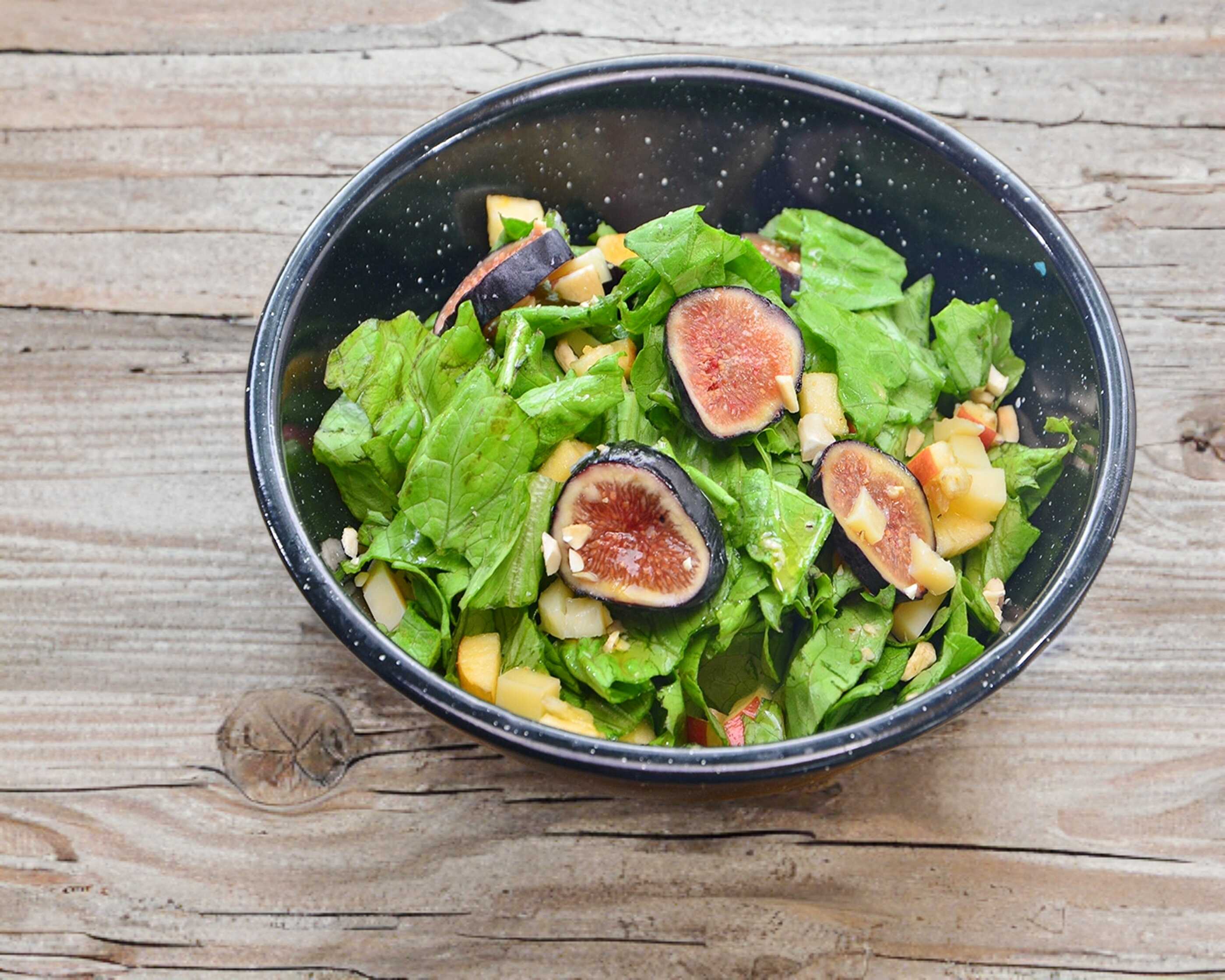 Manzana, higo, nuez, vinagreta de naranja y queso parmesano.