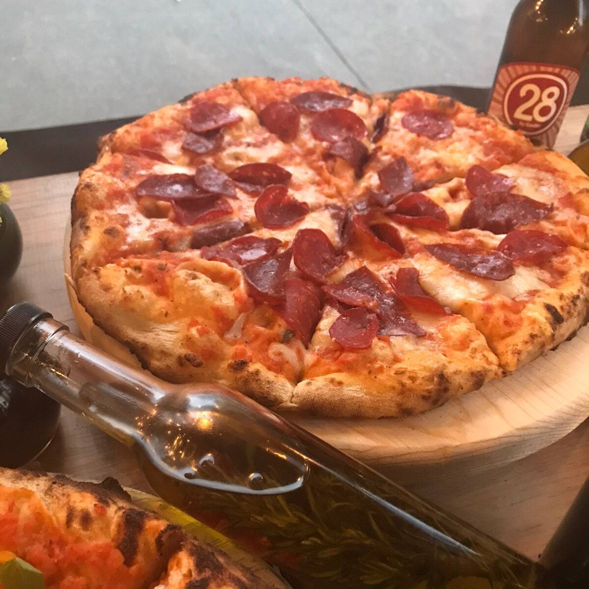 pizza estilo napolitano con salsa de tomate, queso mozzarella, pepperoni y salami