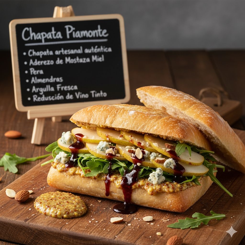 Chapata artesanal autentica de la casa, aderezo de mostaza miel, pera, almendras, queso azul, arugula fresca y reducción de vino tinto.