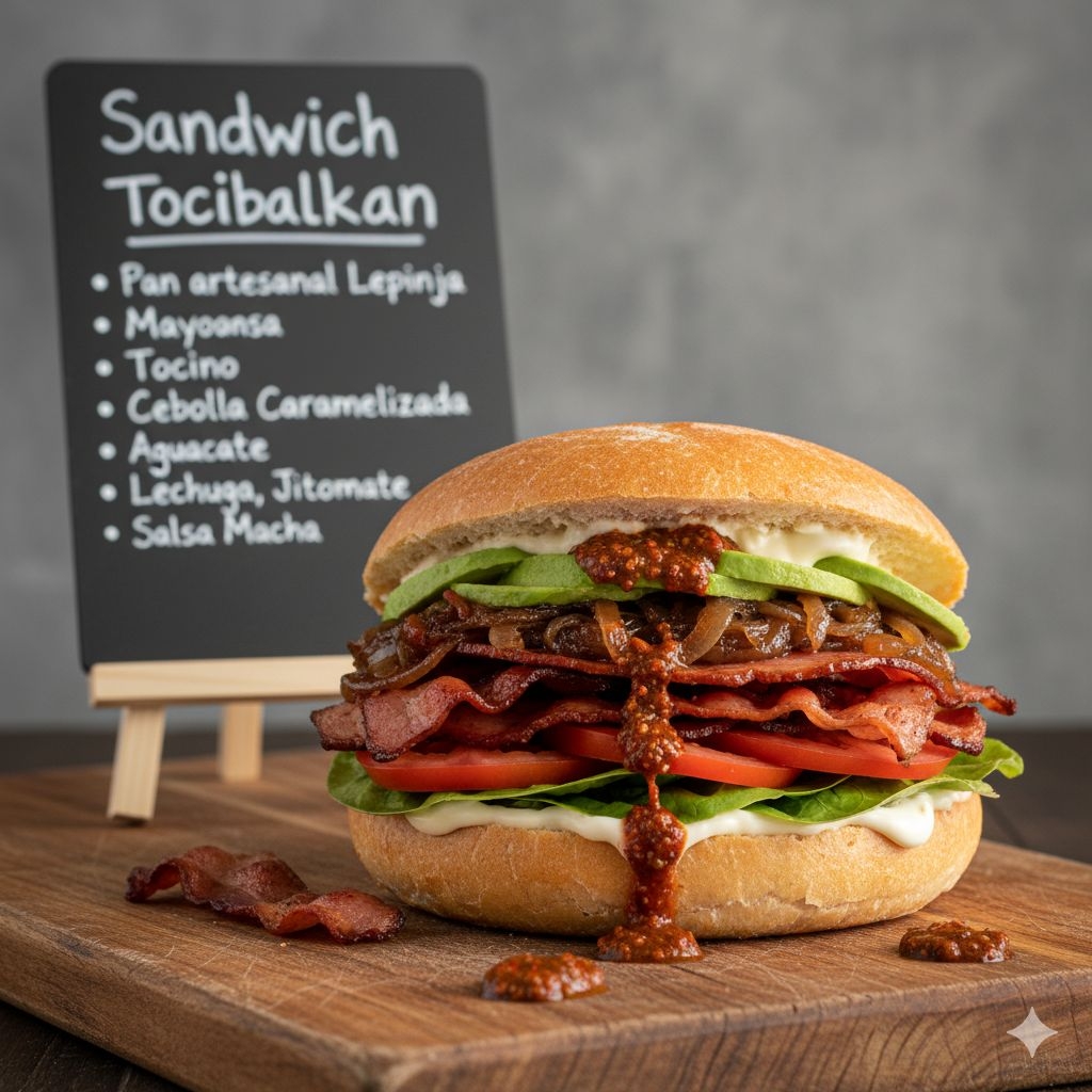 Pan artesanal lepinja tradicional de los balkanes con mayonesa, tocino, cebolla caramelizada, aguacate, lechuga, jitomate y salsa macha.