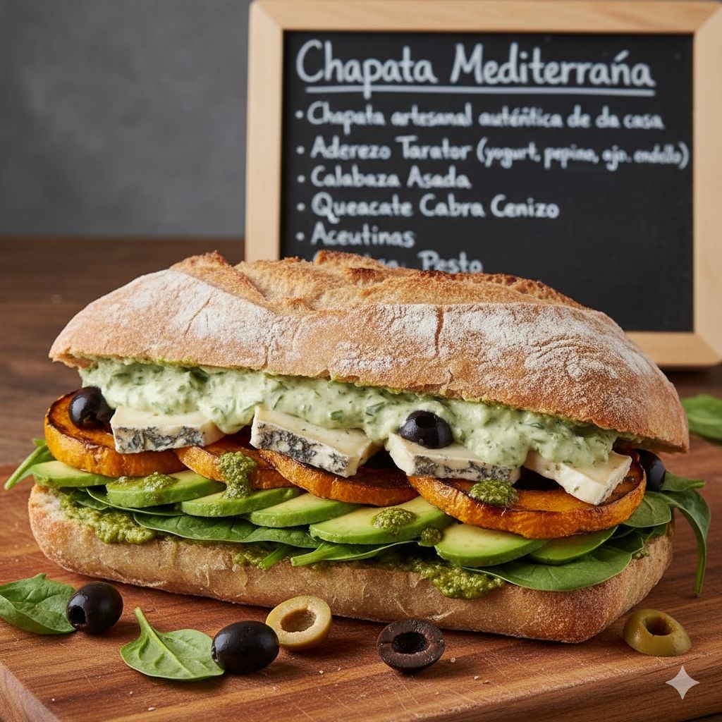 Chapata artesanal autentica de la casa, con aderezo tarator de yogurt, pepino, ajo y eneldo, calabaza asada, queso cabra cenizo, aguacate, espinada, aceitunas y pesto.