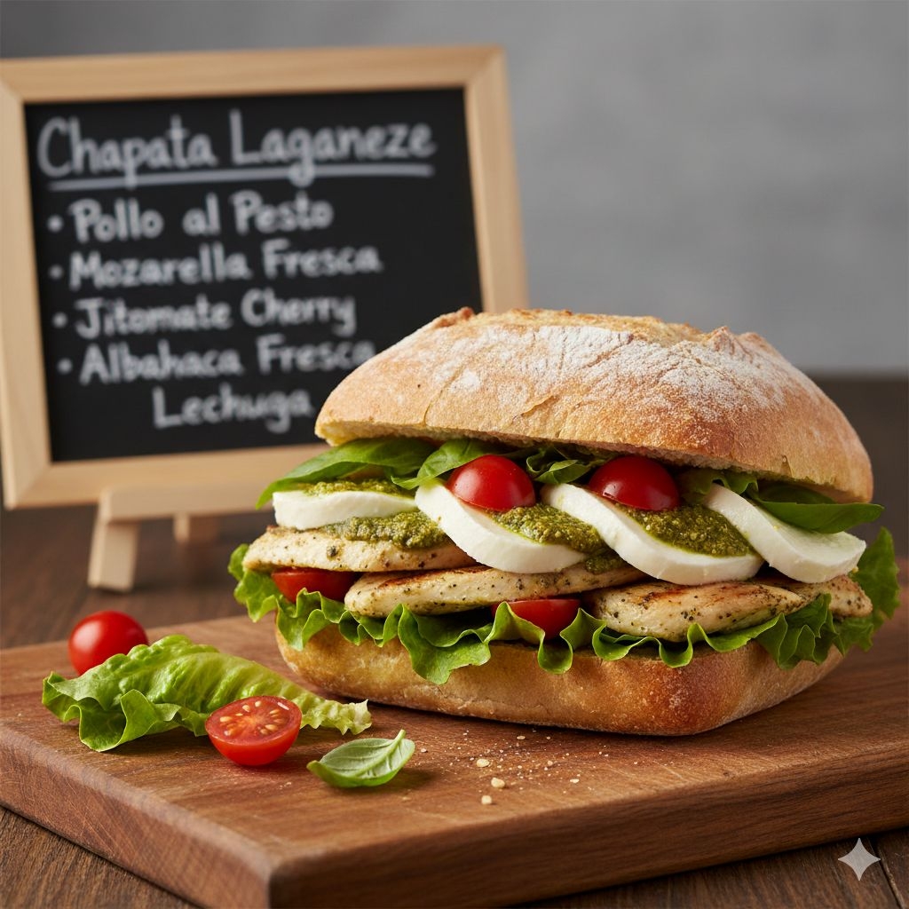 Chapata artesanal autentica de la casa, con pollo al pesto, queso mozarrella fresco, jitomate Cherry, albahaca fresca y lechuga.