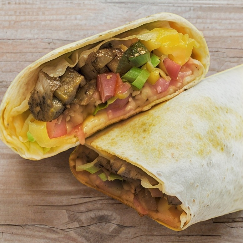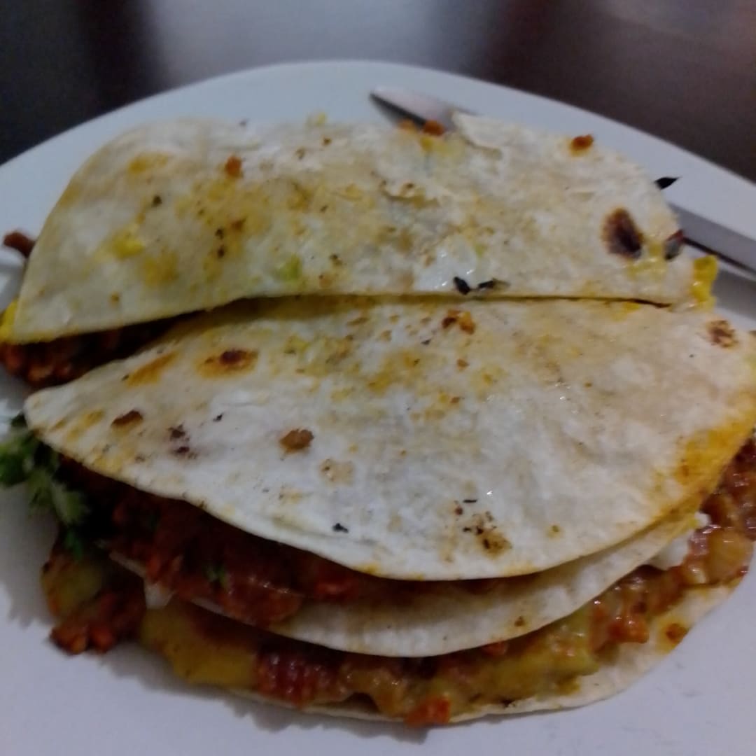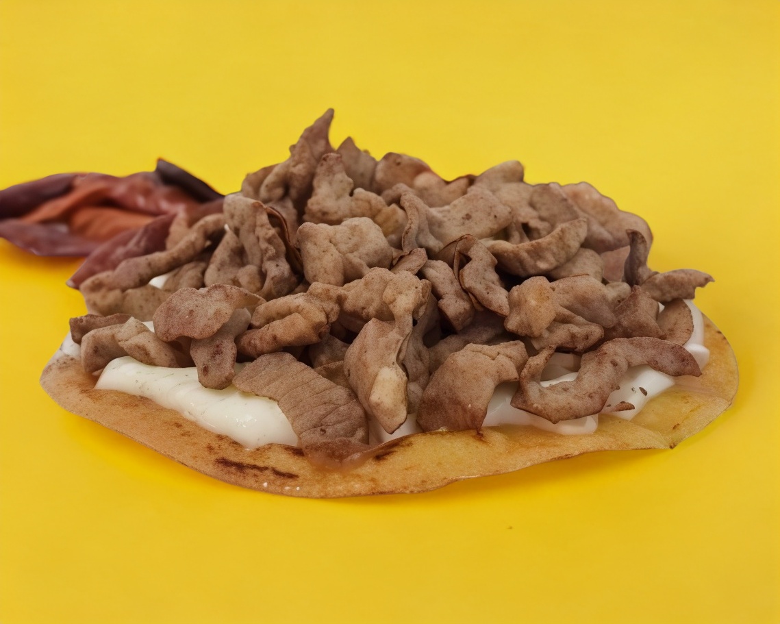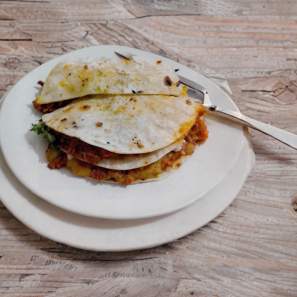 Delicioso Queso manchego 120gr cocinado hasta crear una crocante costra acompañada de 80 gr pastor y tortilla de harina para acompañar