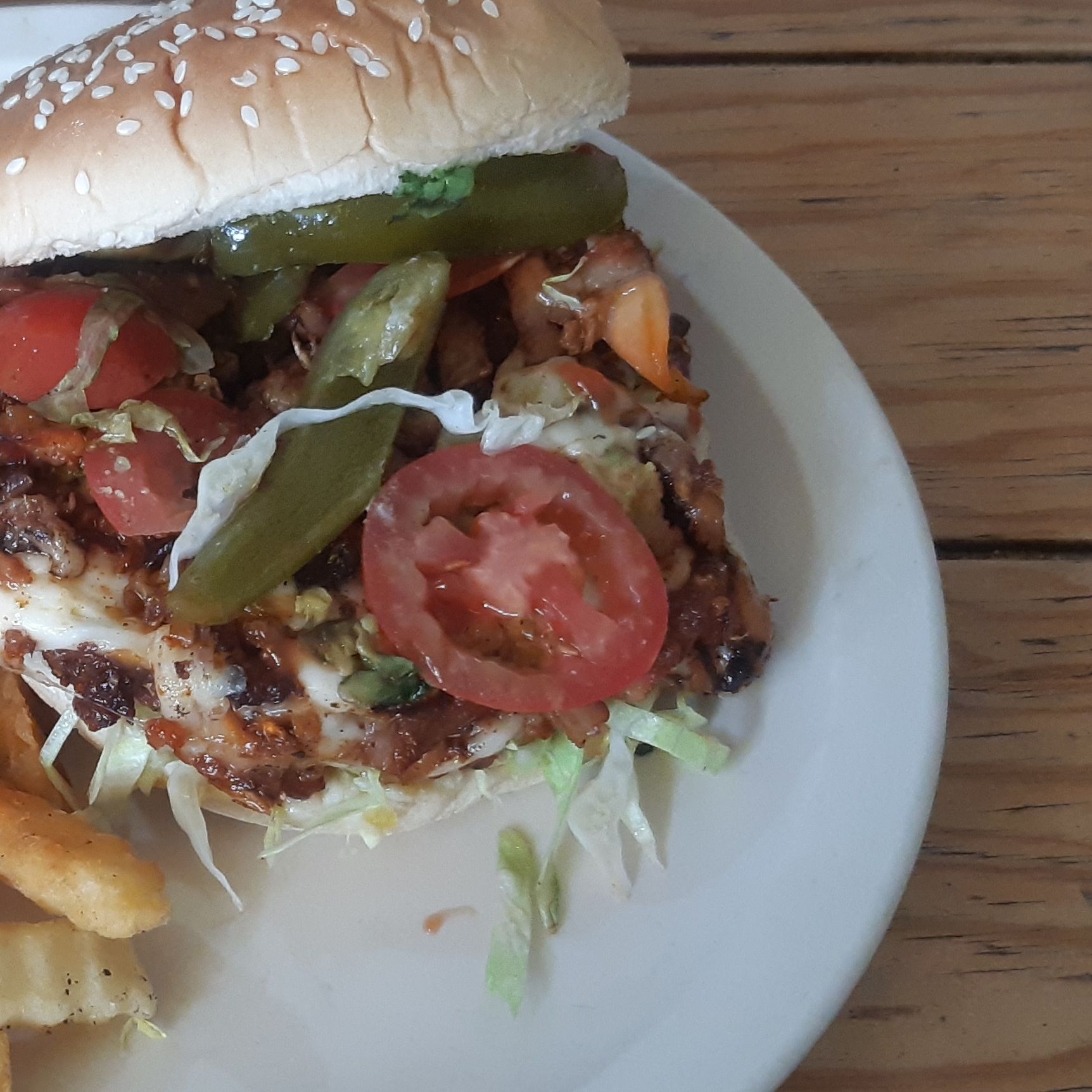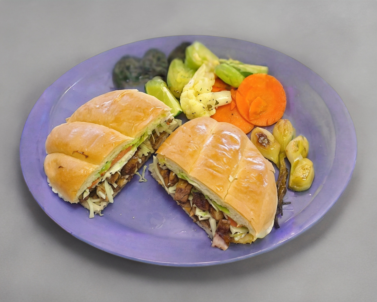 Pechuga con queso, lechuga, jitomte, cebolla, aguacate, rajas, catsup, mostaza y mayoneza