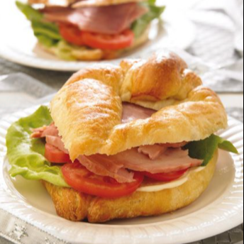 Delicioso cuernito preparado con jamón, queso, rajas de chile, mayonesa y lechuga fresca. Los ingredientes son opcionales para que los ordenes a tu gusto.