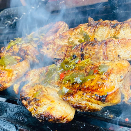 Jugosa pechuga de pollo al grill, bañada en chimichurri, acompañada de puré de papa y verduras al grill.