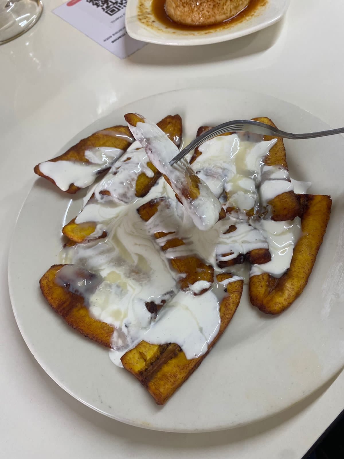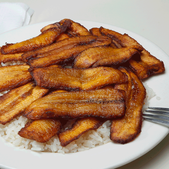 Arroz blanco acompañado de rebanadas de plátano frito.