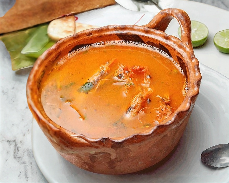 Aproximadamente 700mL Caldo de camarón con camarón pacotilla, almejas, trozos de zanahoria y papa, cebolla y cilantro.
