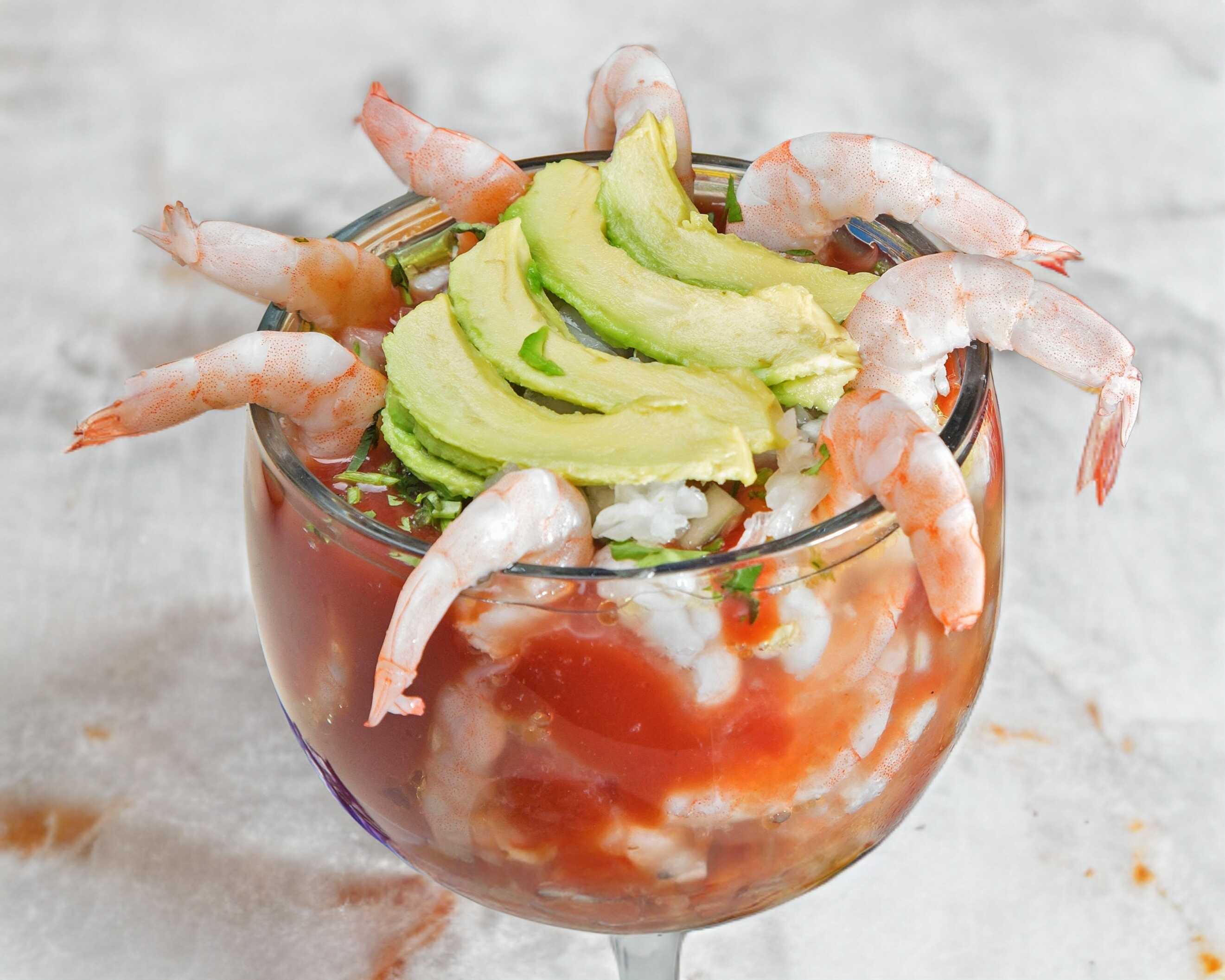 (Aprox. 430.mL) Preparado con camarón pacotilla, aceite de oliva, salsa inglesa, vinagre especiado, cátsup, cebolla, cilantro y aguacate.