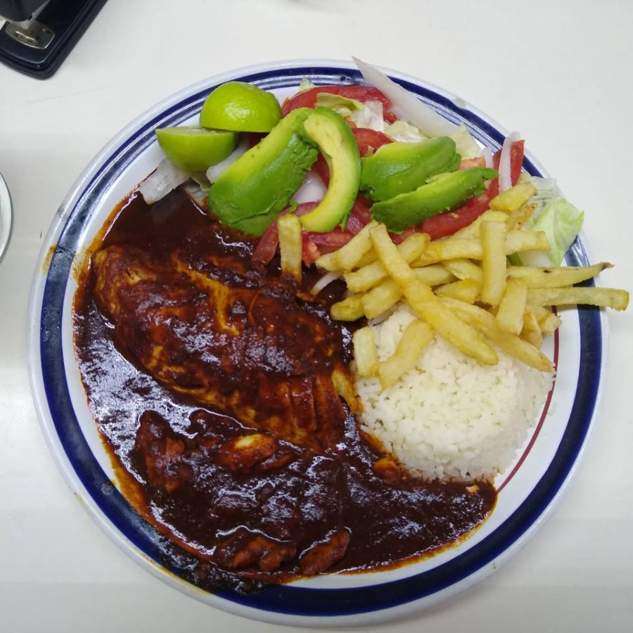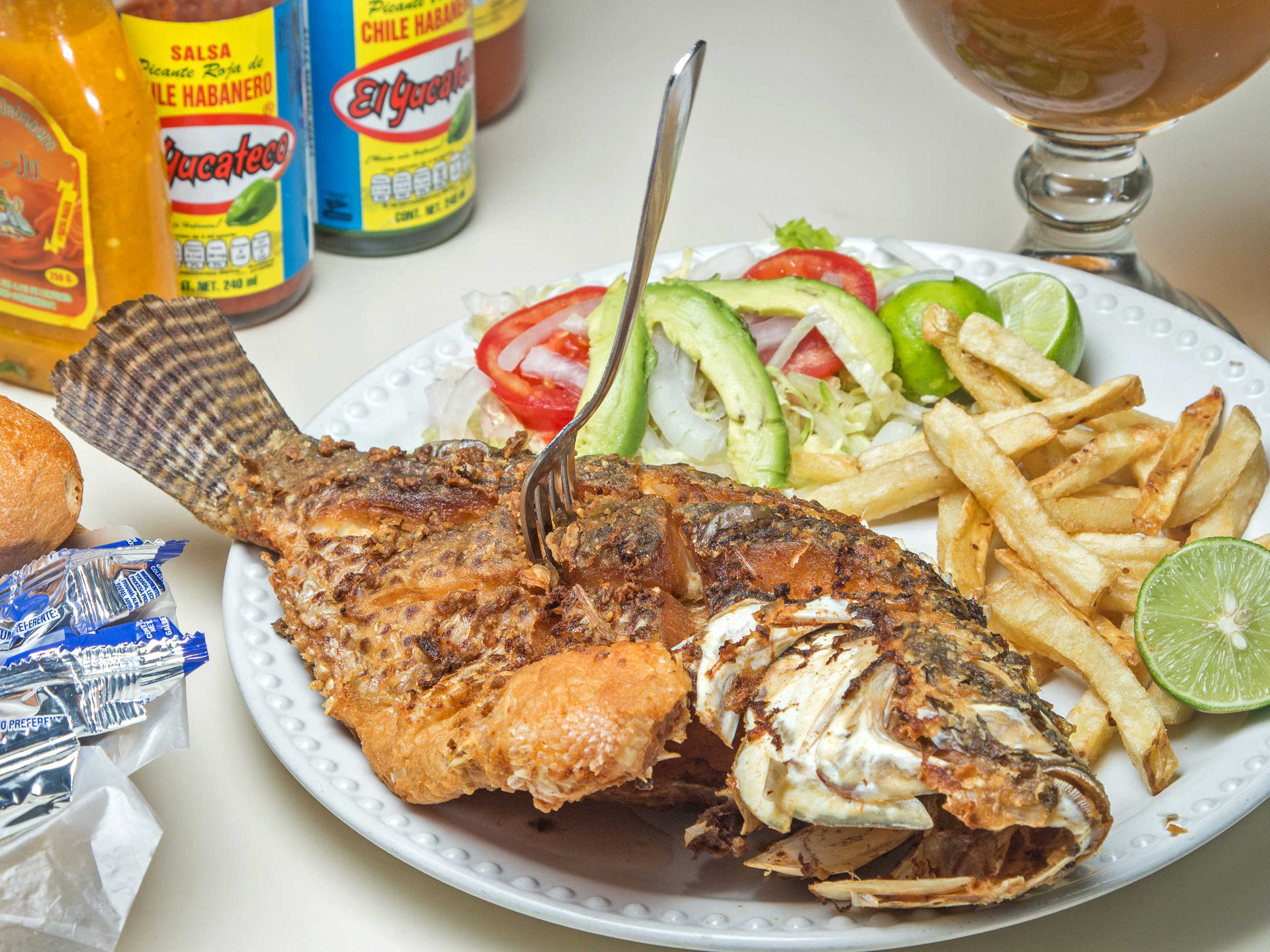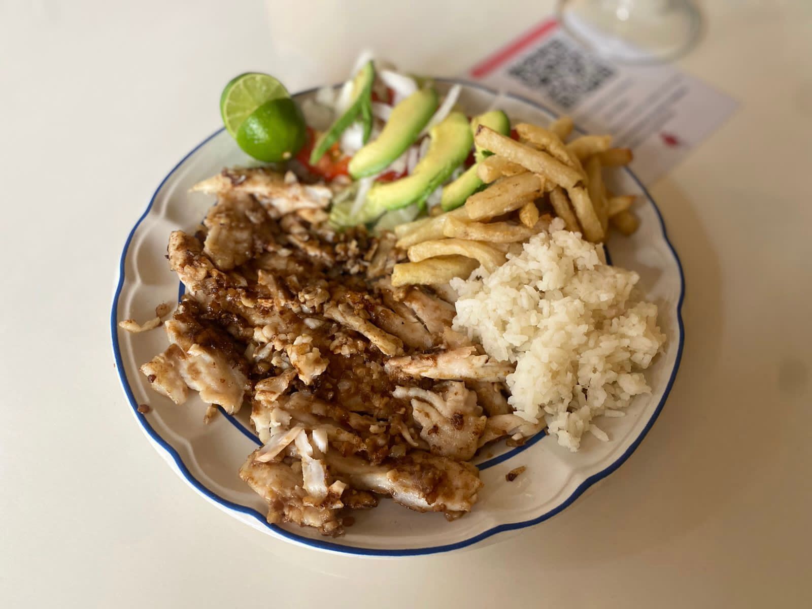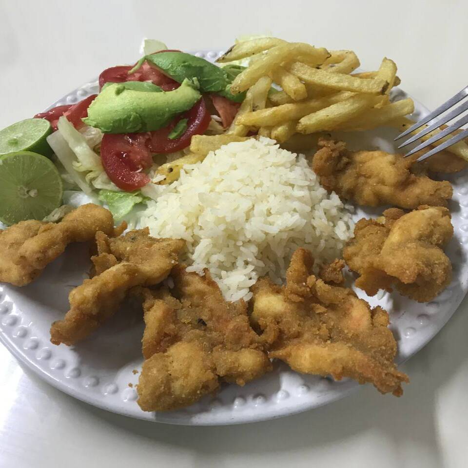 3 piezas de filete de pescado blanco rebozado, acompañados con ensalada de lechuga, jitomate, cebolla, aguacate, papas a la francesa y arroz rojo.
