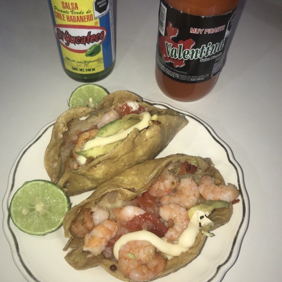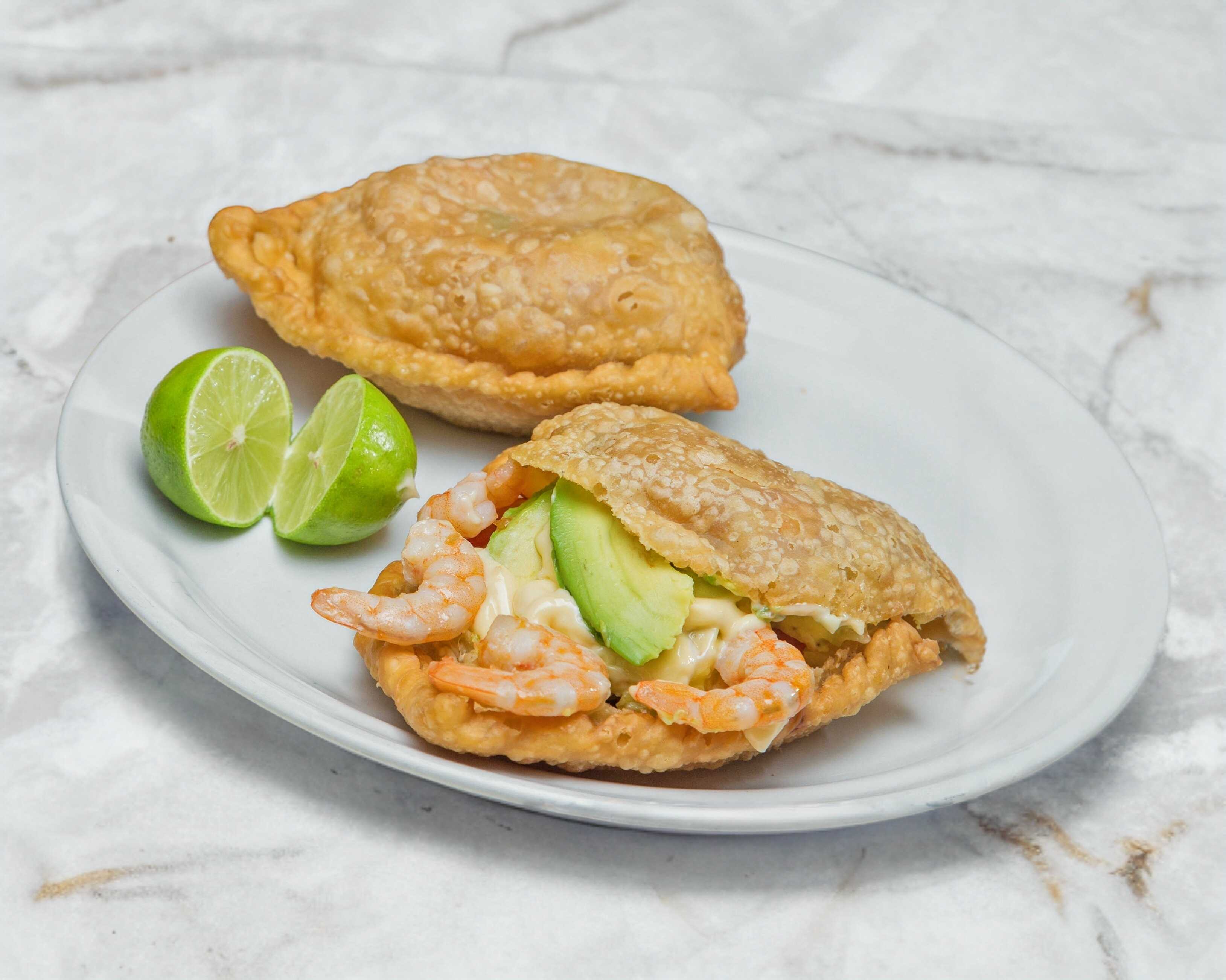 Orden de 3 quesadillas fritas de camarón pacotilla preparadas con cebolla y jitomate, terminadas con aguacate y mayonesa.