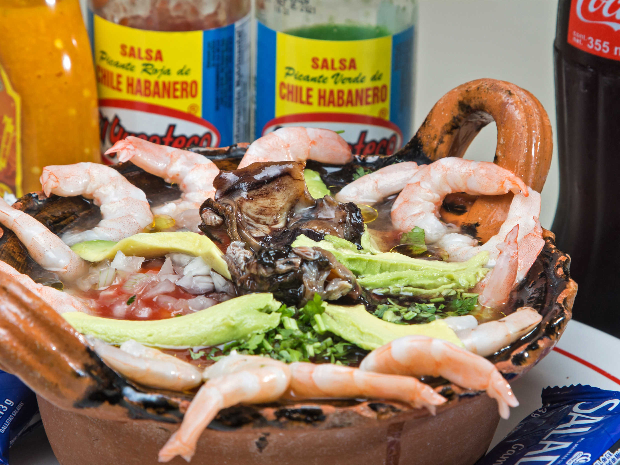 Preparado con camarón pacotilla, ostiones, aceite de oliva, salsa inglesa, vinagre especiado, catsup, cebolla, cilantro y aguacate.
