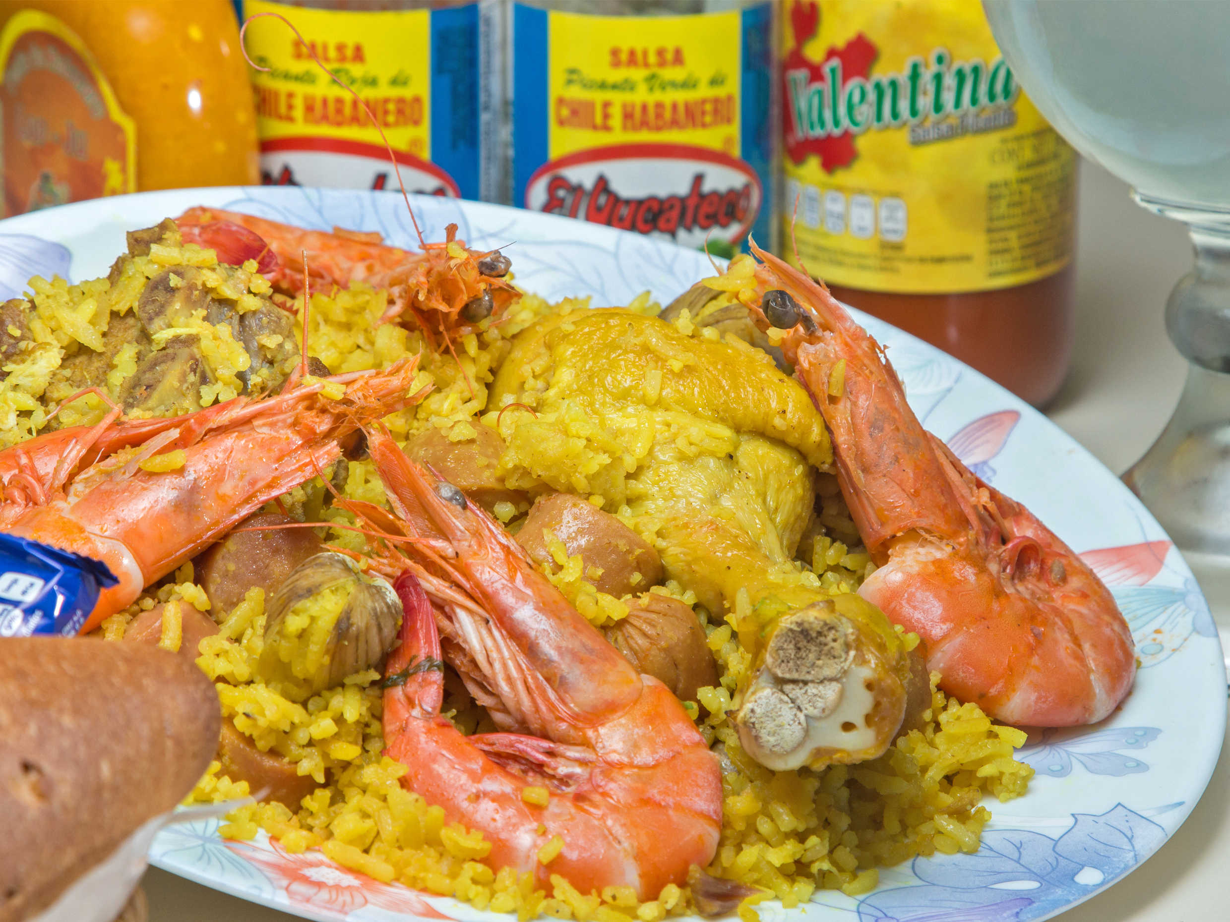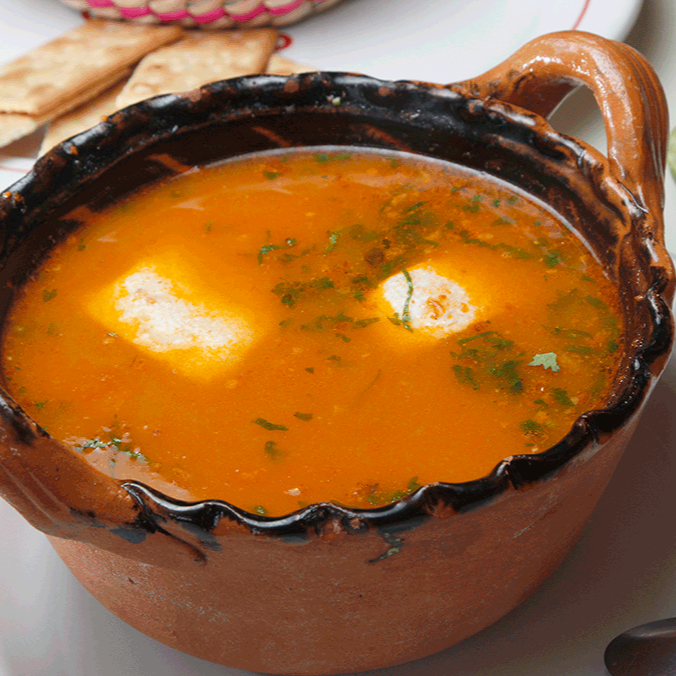 Sopa de mariscos con base de consomé de pescado y mariscos; surimi, calamar, jaiba, pulpo, ostión, camarón y camarón pacotilla, almejas, trozos de zanahoria y papa, cebolla y cilantro.