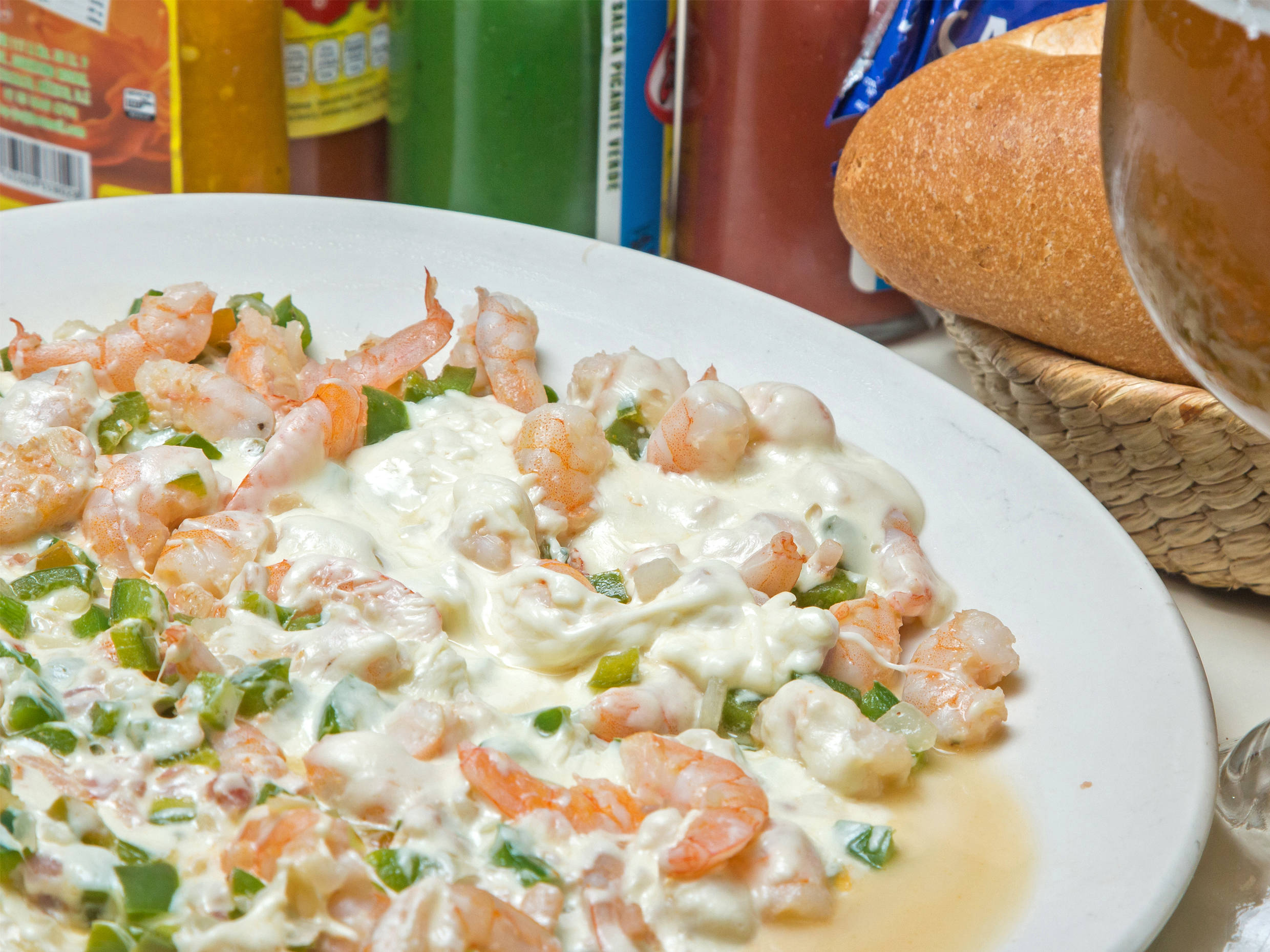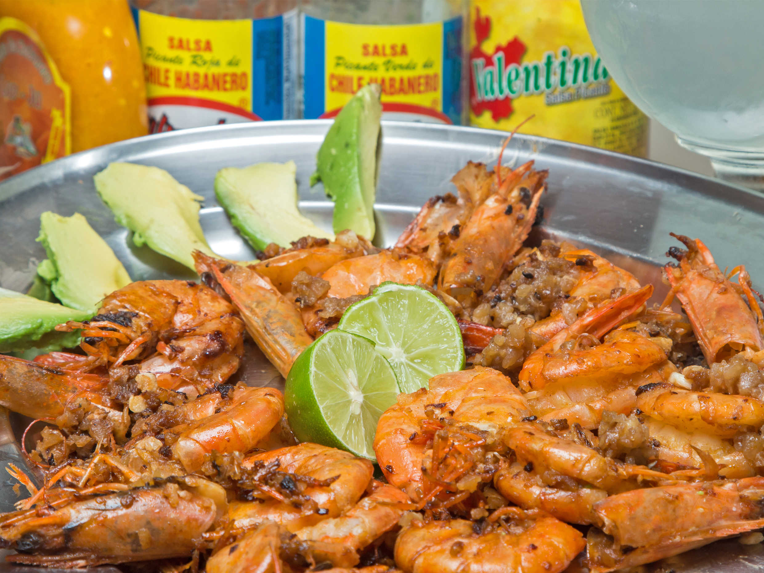 Orden de camarones (6 piezas) cocinados con trozos de ajo frito, acompañados con ensalada de lechuga, jitomate, cebolla, aguacate, papas a la francesa y arroz blanco.