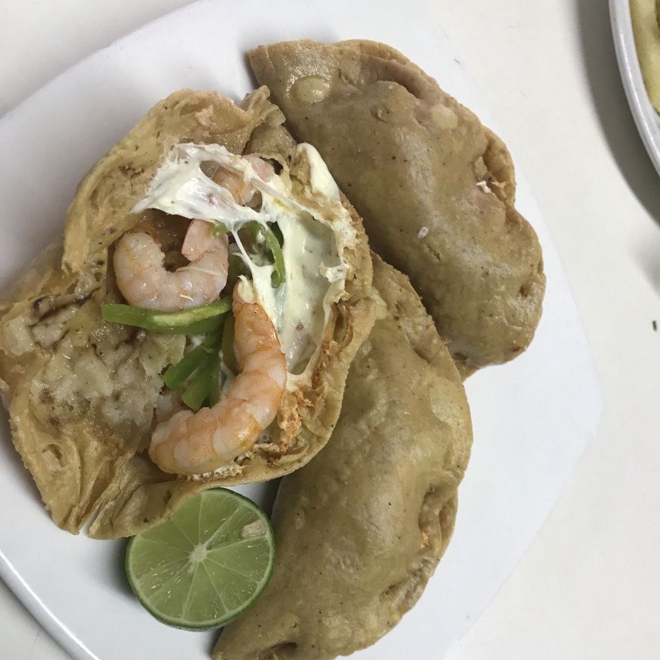 Orden de 3 quesadillas fritas de camarón pacotilla con queso Oaxaca y rajas de chile jalapeño.