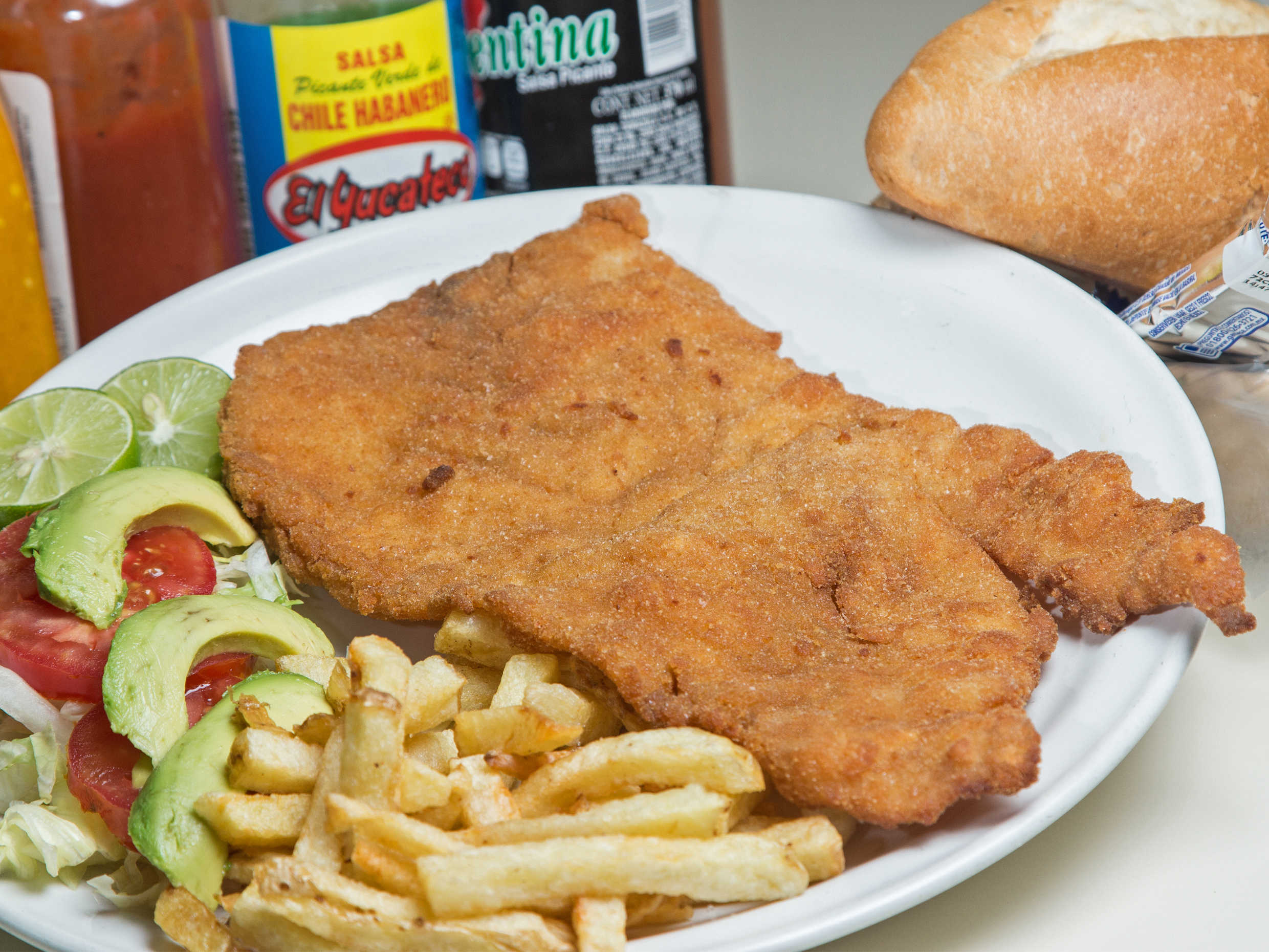 Aproximadamente 200 gramos. Filete de róbalo empanizado, acompañado con ensalada de lechuga, jitomate, cebolla, aguacate y papas a la francesa.