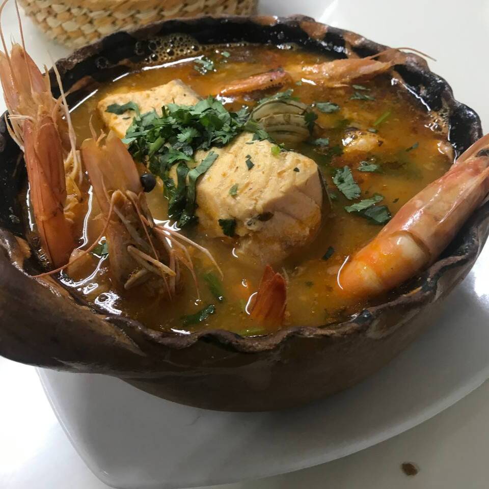 (Aprox. 700.mL) Caldo de pescado de róbalo con pescado en trozo, almejas, trozos de zanahoria y papa, cebolla y cilantro.