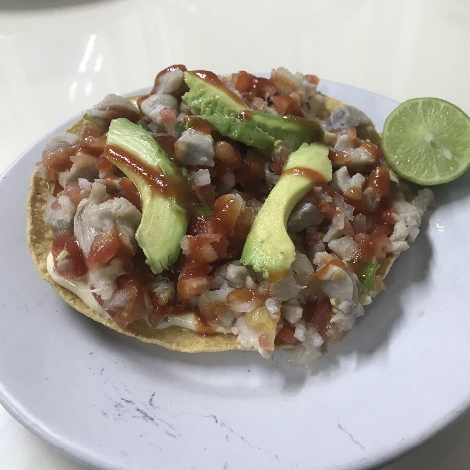 Una tostada con ceviche de pescado (a base de jugo de limón, cebolla, jitomate, chile jalapeño), terminadas con cilantro, aguacate y cátsup.