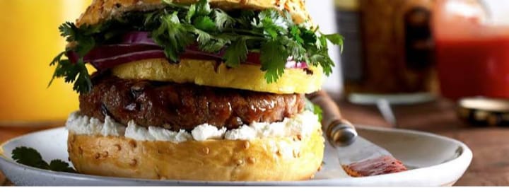 113 gr de res, queso amarillo, tocino, piña, queso oaxaca, jitomate, cebolla, rajas y lechuga.
