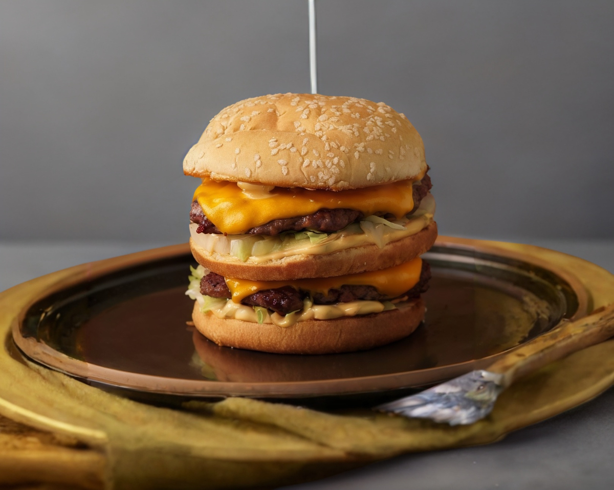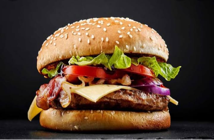 360 gramos de carne de res dividida en 3 carnes, queso amarillo, harto tocino, jítomate, cebolla, rajas y lechuga.