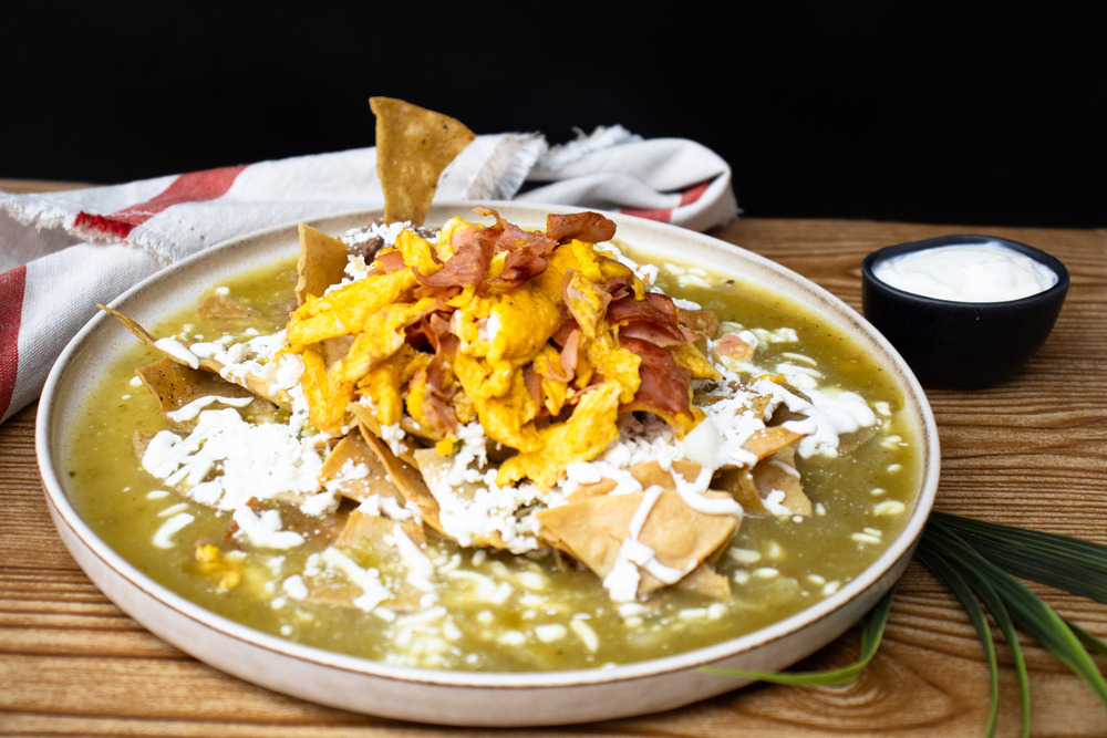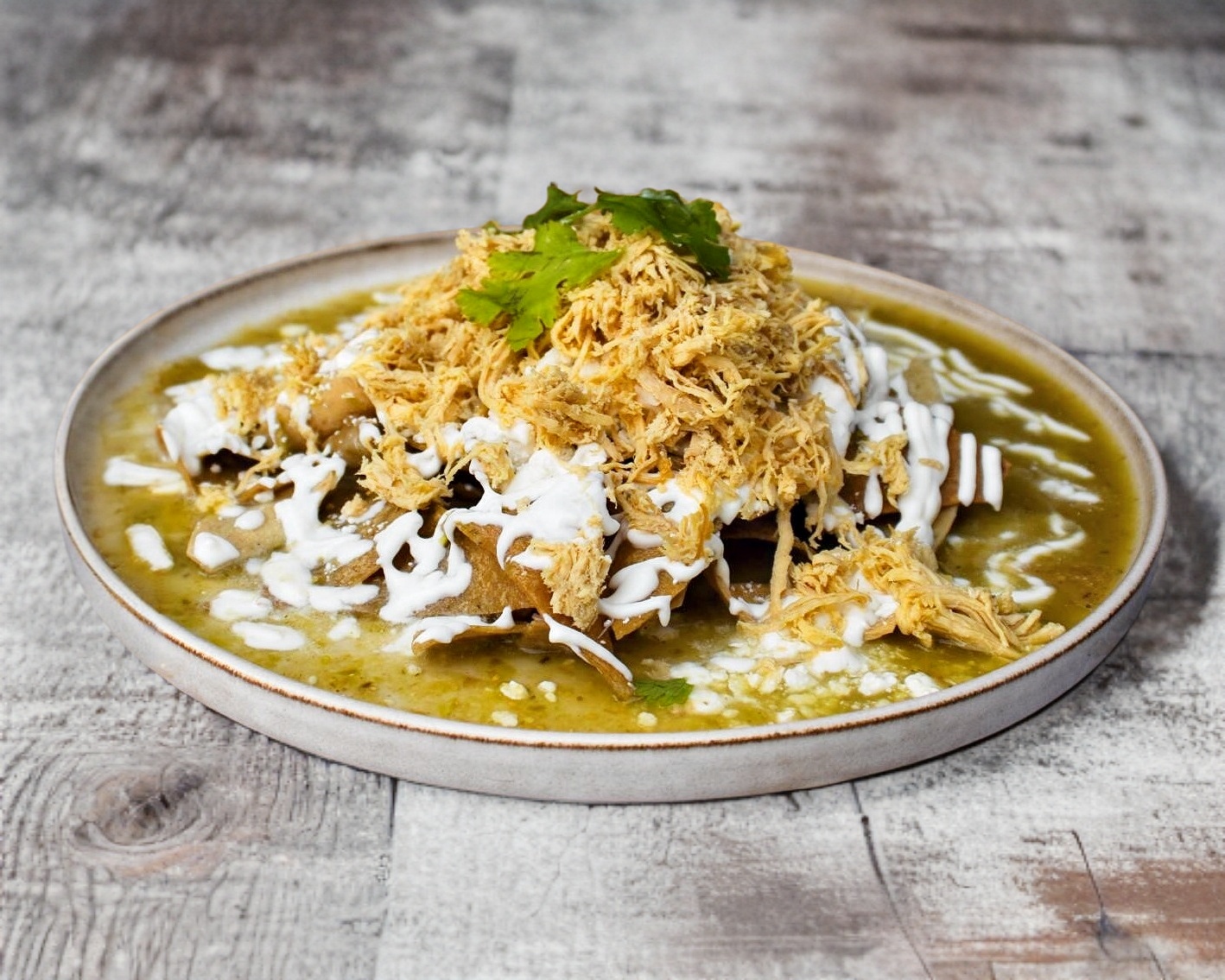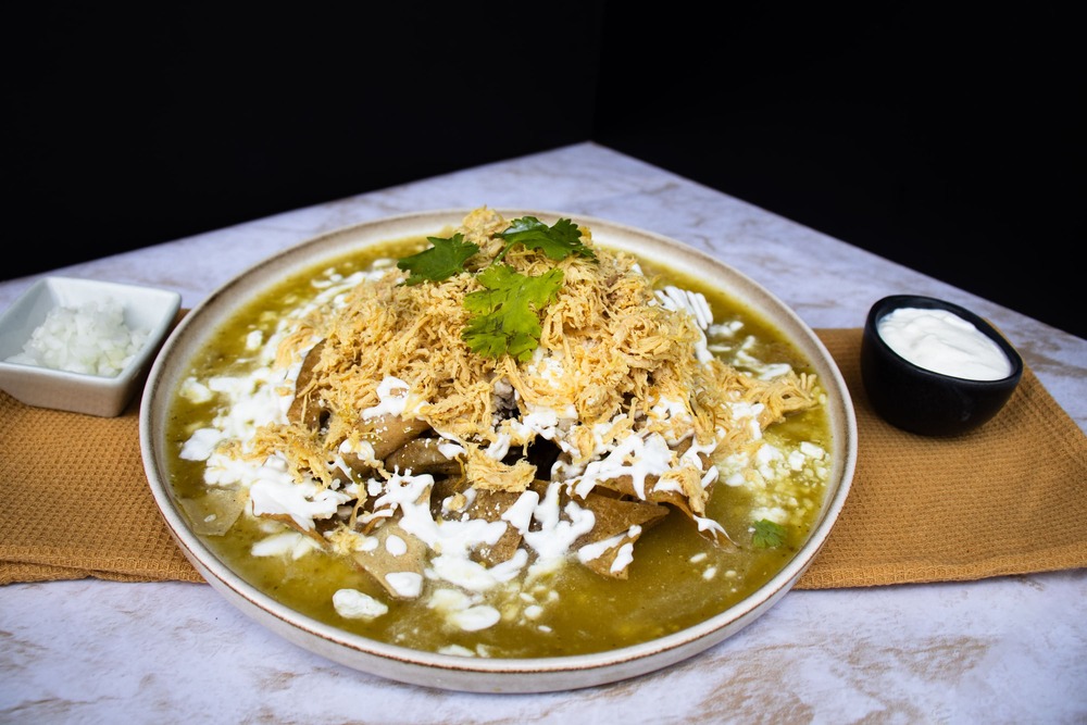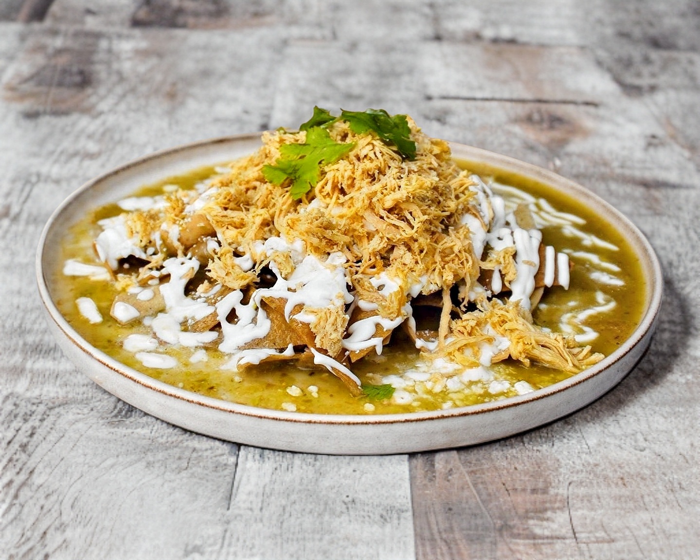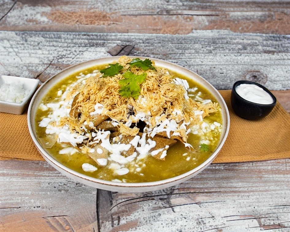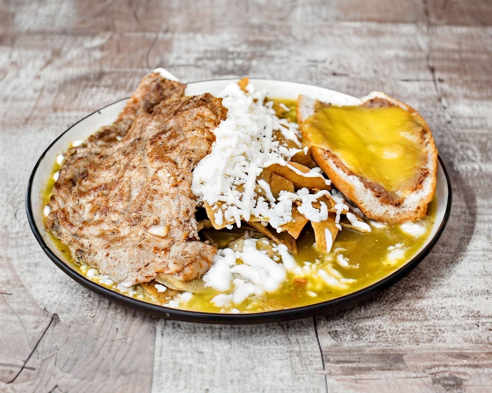 Totopos remojados en salsa verde o roja, con cebolla crema y queso, acompañado de tu proteína favorita.
