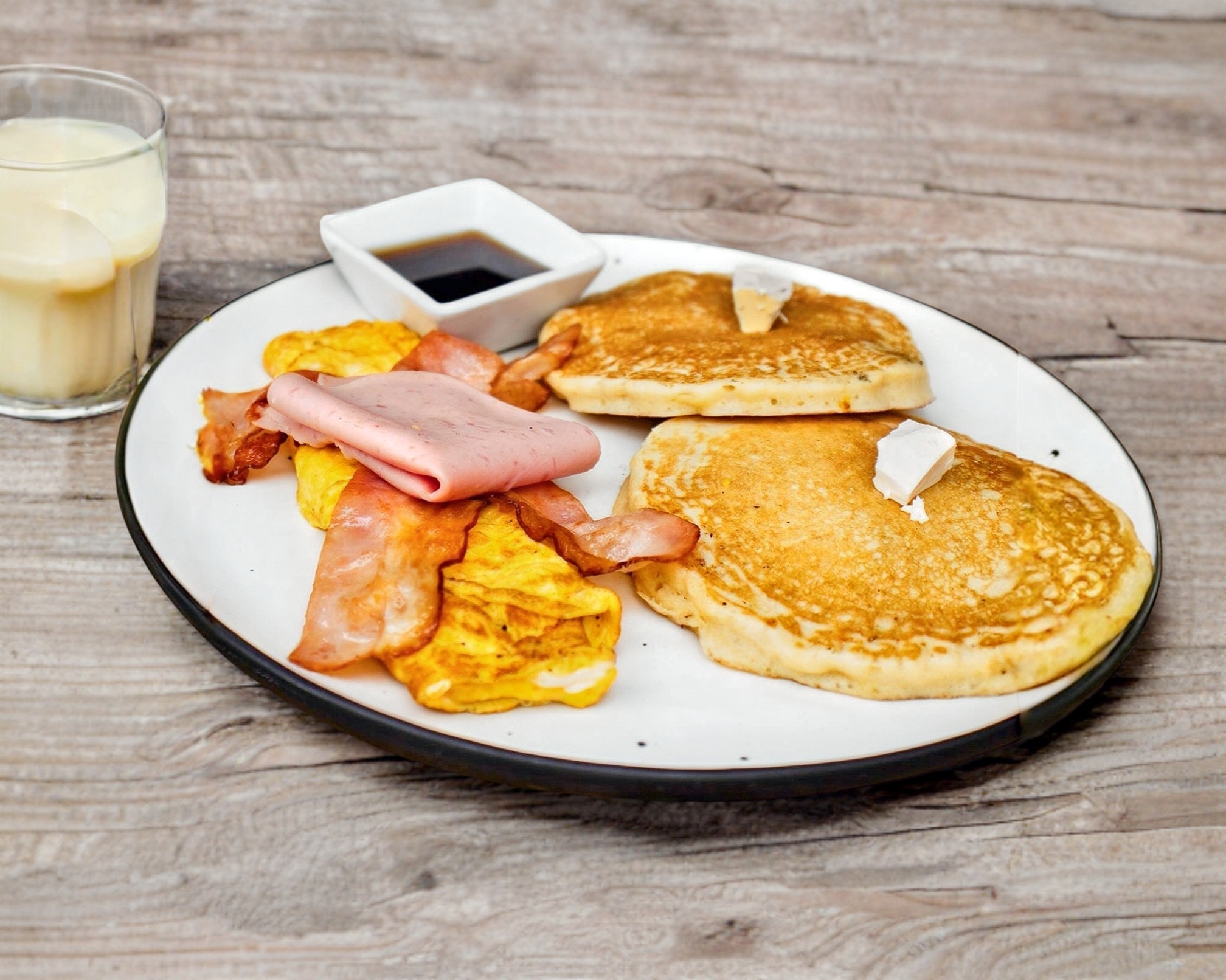 2 pz de Hotcakes, 2 pz de Huevo Revuelto, 2 Tiras de Tocino y 1 Rebanada de Jamón
