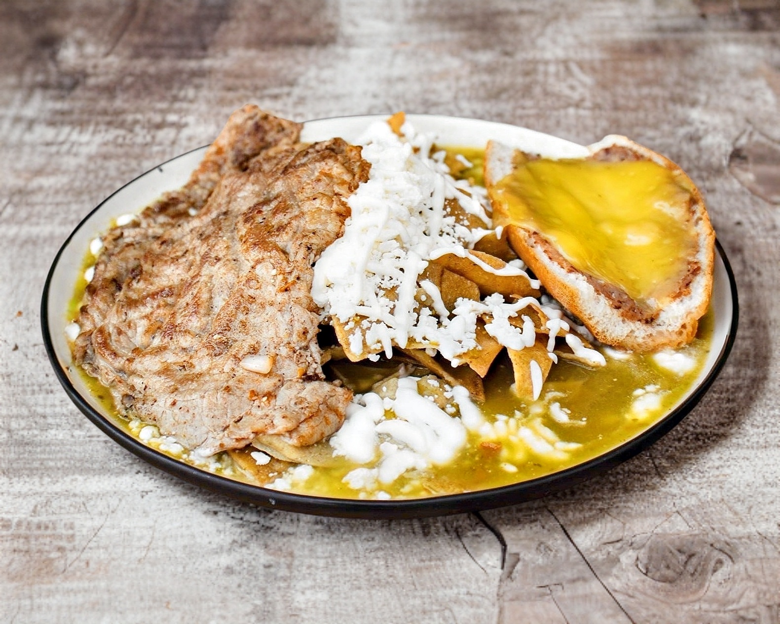 Chilaquiles verdes o rojos con Bistec Asado y Un Mollete Gratinado.