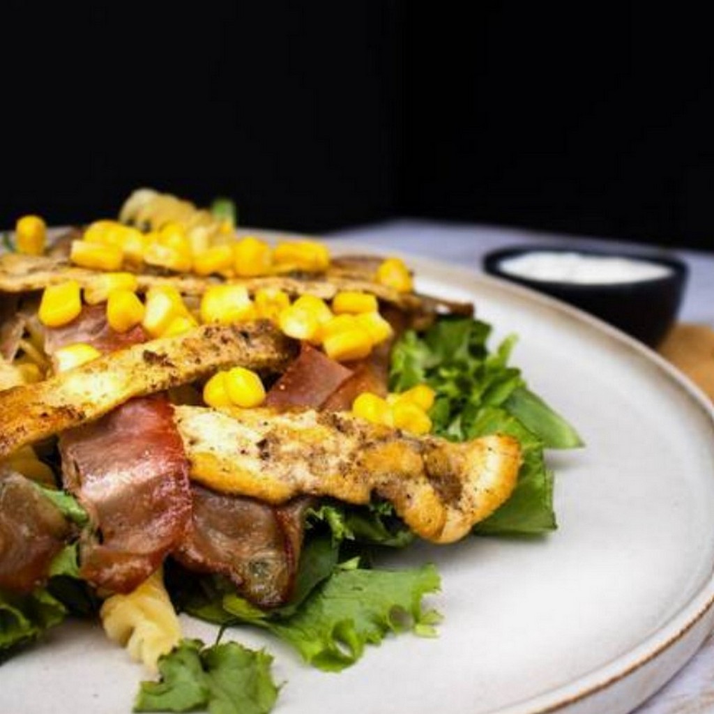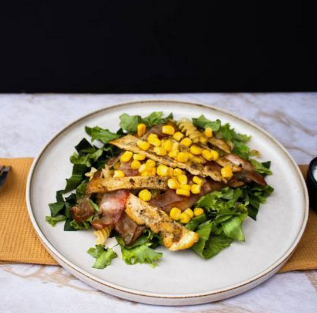 Lechuga, espinaca, pasta, grano de elote, pechuga asada y tocino.