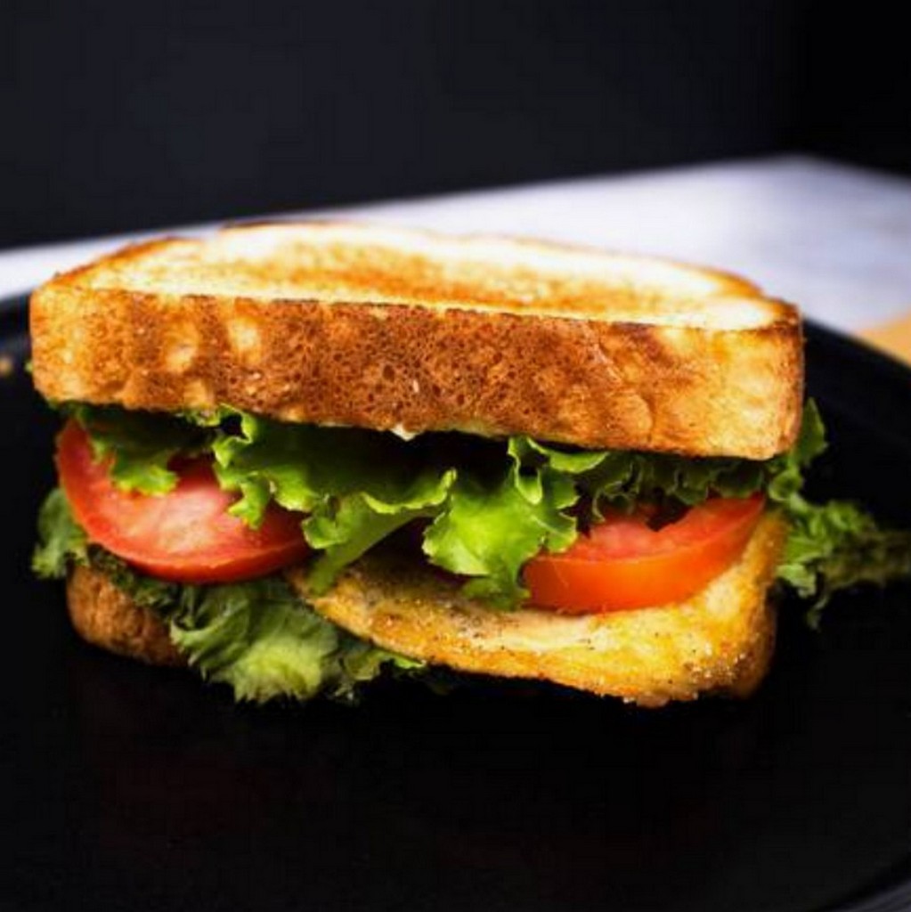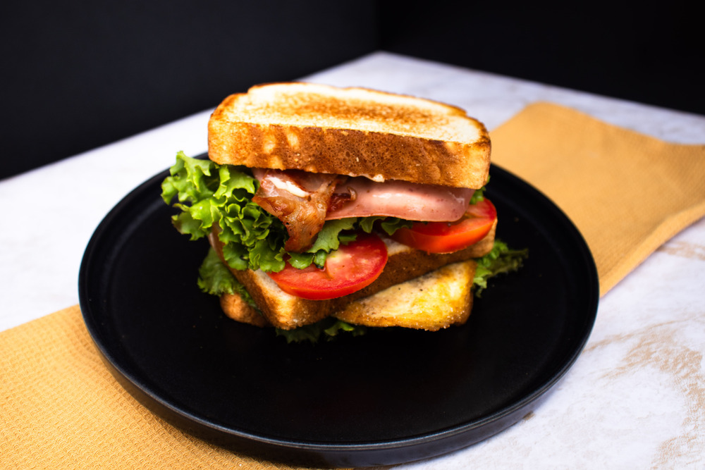2 panes, huevo estrellado en medio, jamón, tocino, queso amarillo, lechuga, jitomate, frijoles y mayonesa.