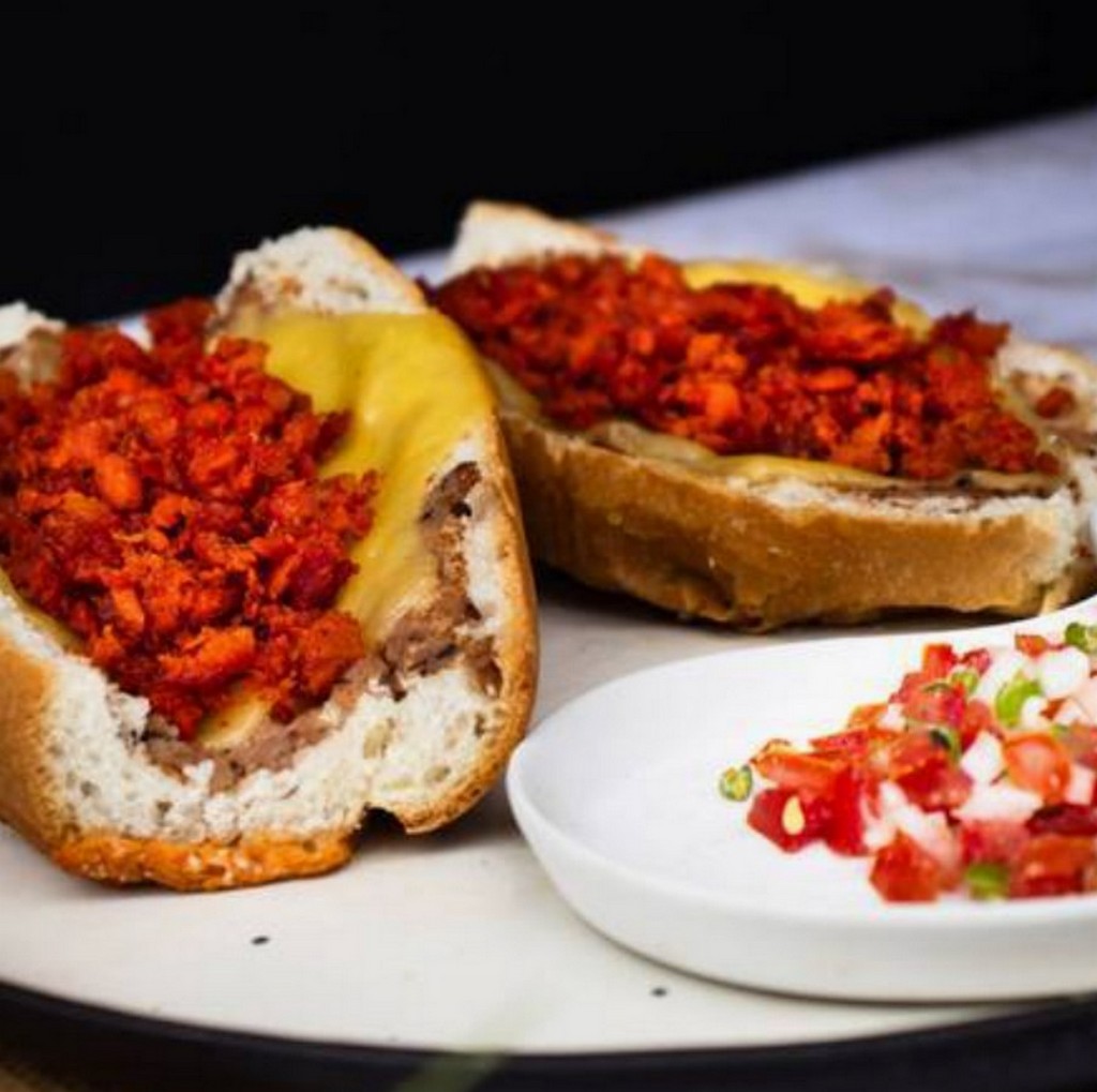 Bolillo doradito con frijoles, gratinados con queso manchego y Chistorra.